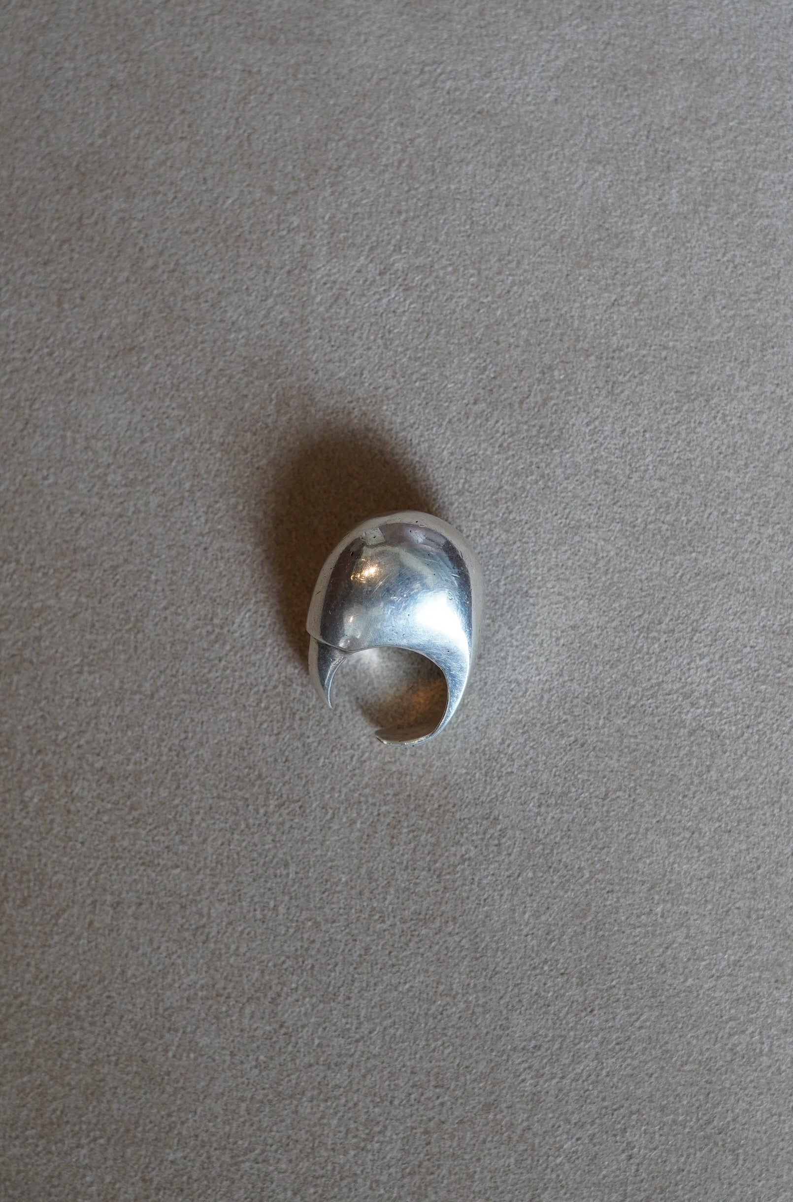 こちらの商品はWEB SHOPからはご購入頂けません。ご購入依頼、その他詳細は CONTACTからお問い合わせ下さい。 Not available for cart purchase.Please contact us via the CONTACTpage for orders or inquiries.エルサペレッティデザインのユニークなシルバーリングです。猛禽類の爪のモチーフでデザインされたドーム型のリングとなります。通称beak ring(くちばしリング)とも言われています。こちらは70年代初頭に製作されたプロトタイプで、非常に珍しいモデル。オープンエンドで比較的サイズの自由度があります。内側は抉られておりますがデザイン状程よい重みがございます。その他詳細画像をご希望のお客様はお問い合わせくださいませ。VINTAGE ELSA PERETTIYear:early70sCountry:unknownMaterial:STERLING SILVERSize:おおよそ5号〜7号前後Condition:一部小キズ、経年のダメージ等が見受けられます。年代相当のヴィンテージコンディションです。ヴィンテージにつき、保存袋、箱等は付属致しません。