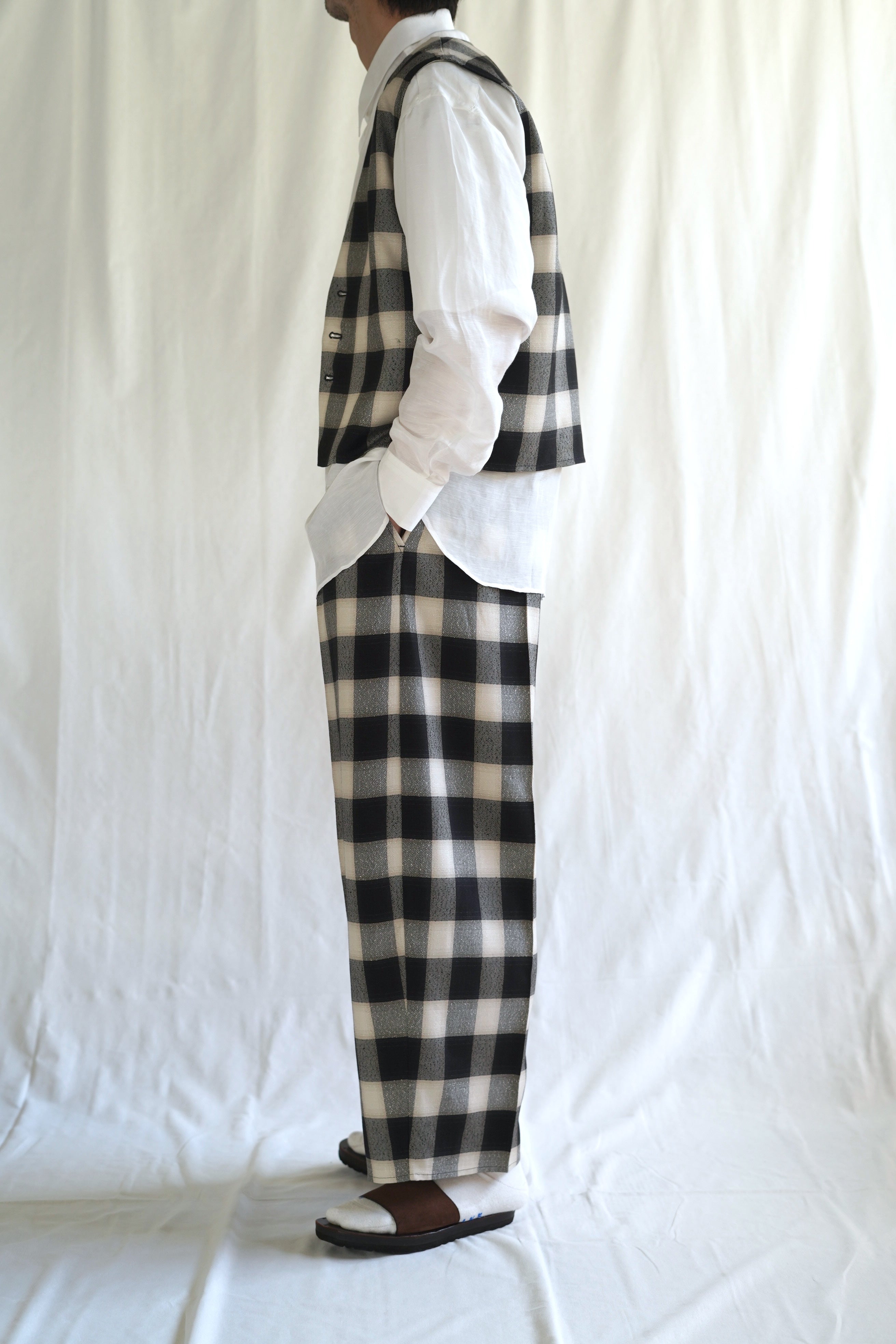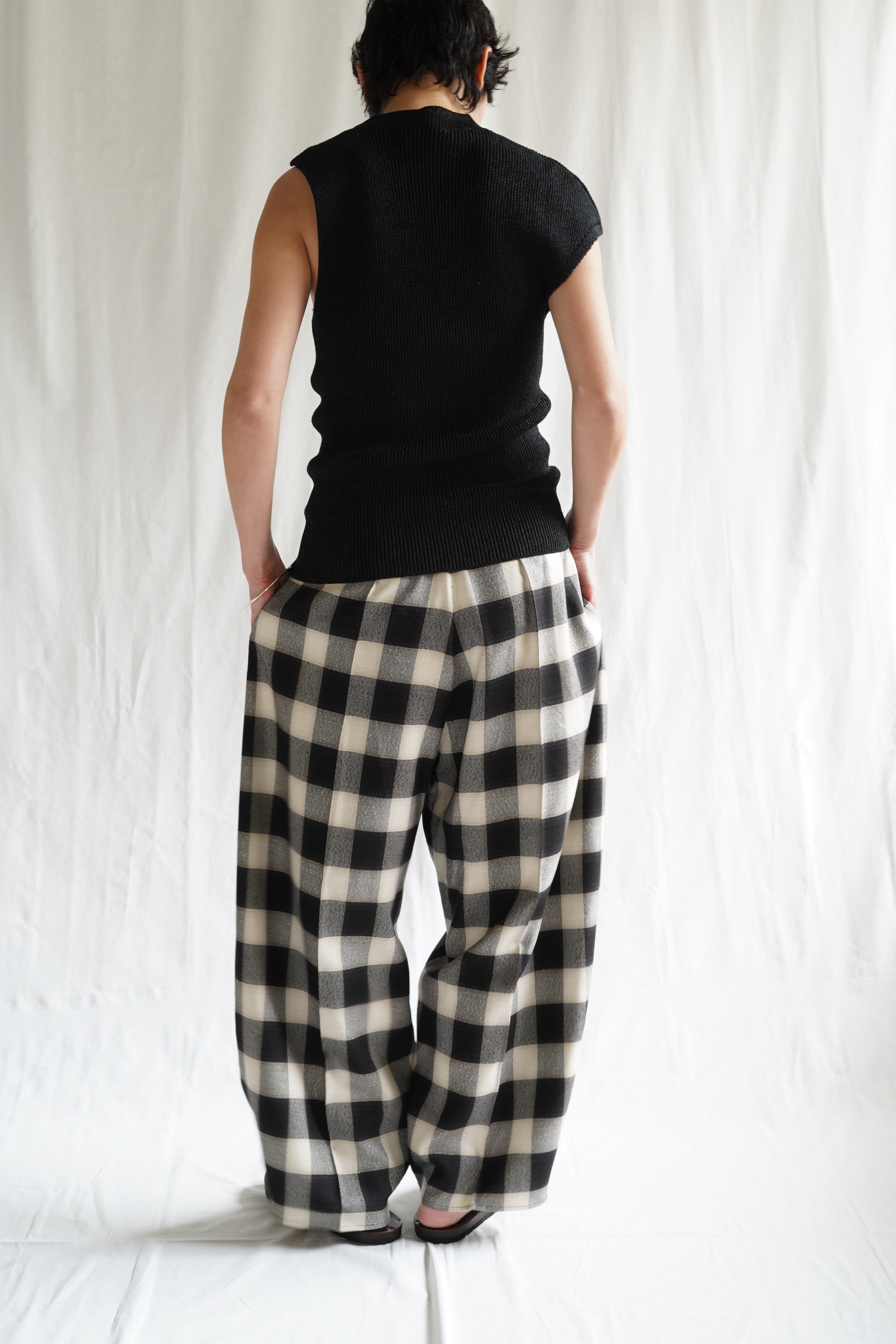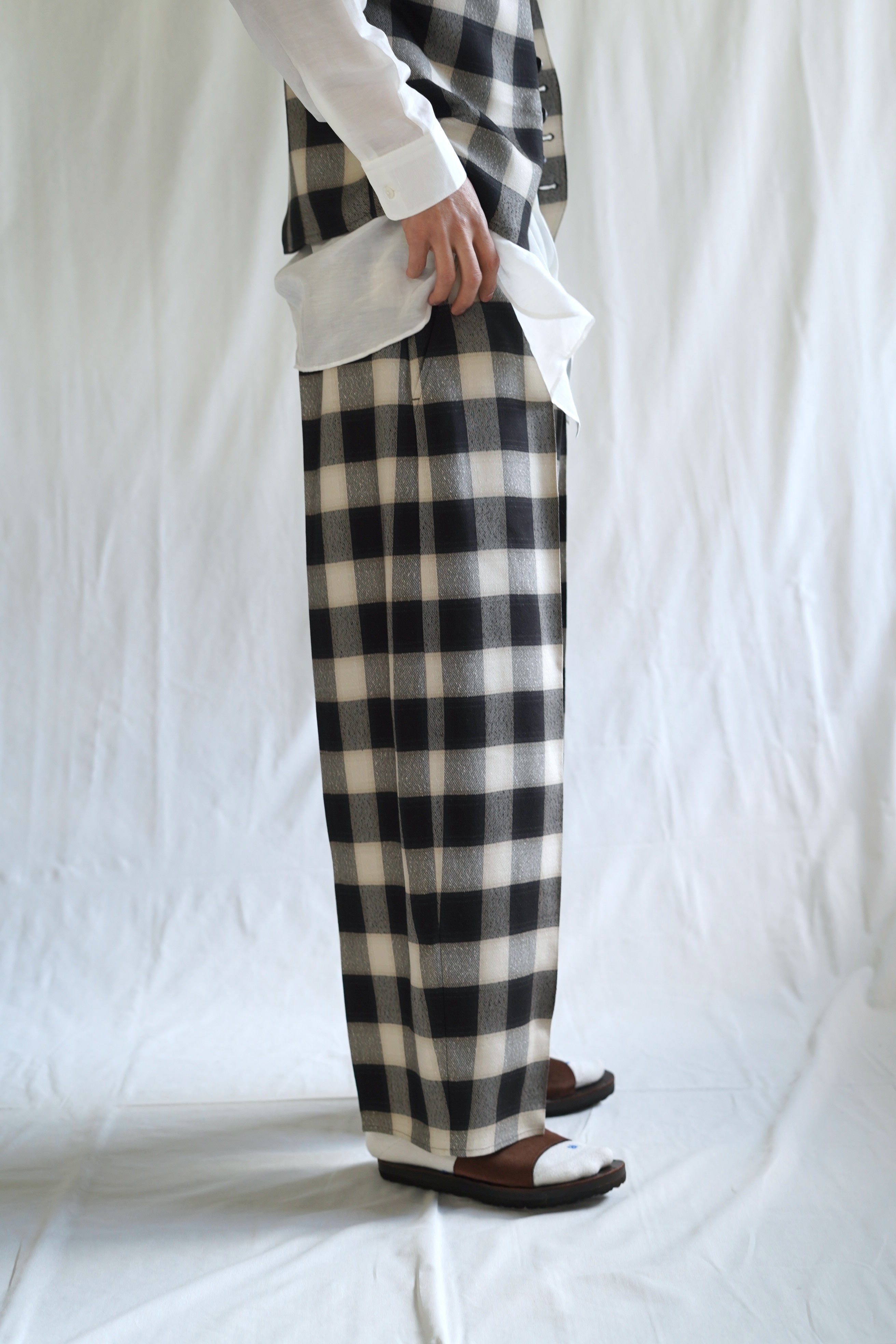 リラックスシルエットのモロッカンパジャマパンツです。こちらは通常のモロッカンパジャマパンツをフルレングスにモディファイした一本です。程よくワイドでシルエットを拾わず、絶妙なバランスでとにかくきまりの良いパンツは、暑い時期にも快適でデイリーはもちろん、旅に持っていくのも最適な一本です。エフォートレスであり、リラックス感のあるシルエット。CRISTASEYAMATERIAL:100% MODALCOLOR: BLACK/CREAM CHECKSSIZE:S,M173cm /165cm M