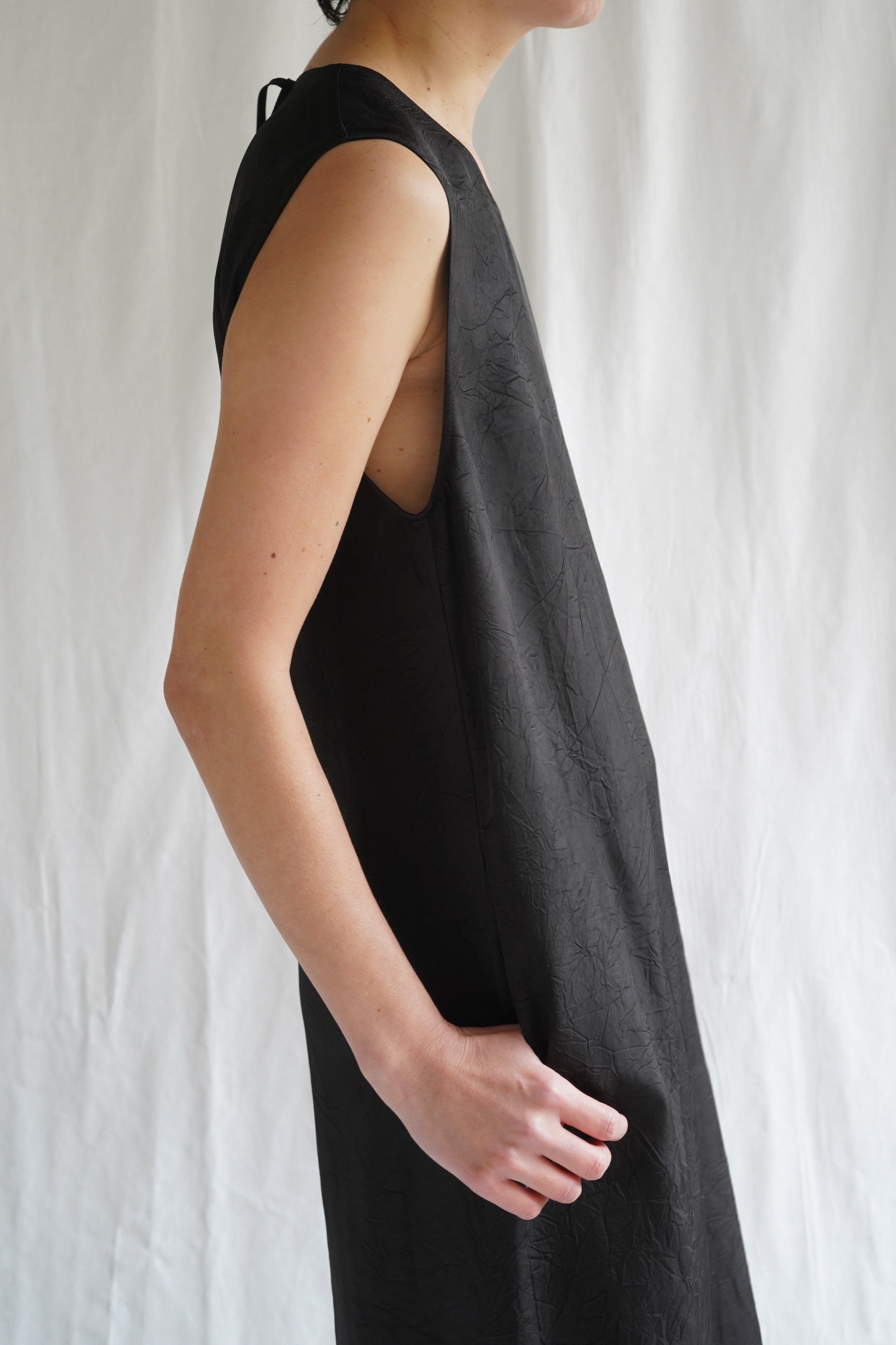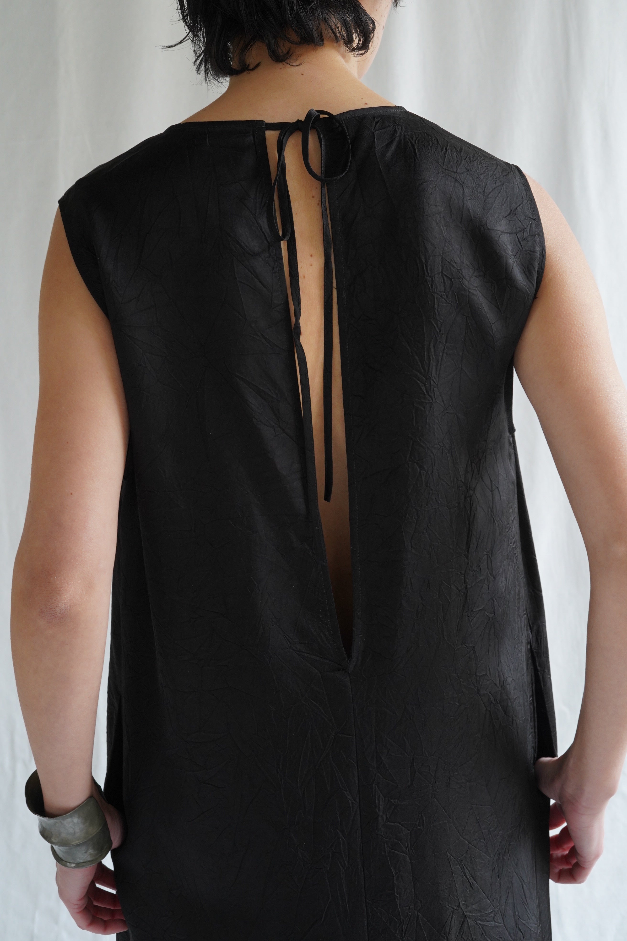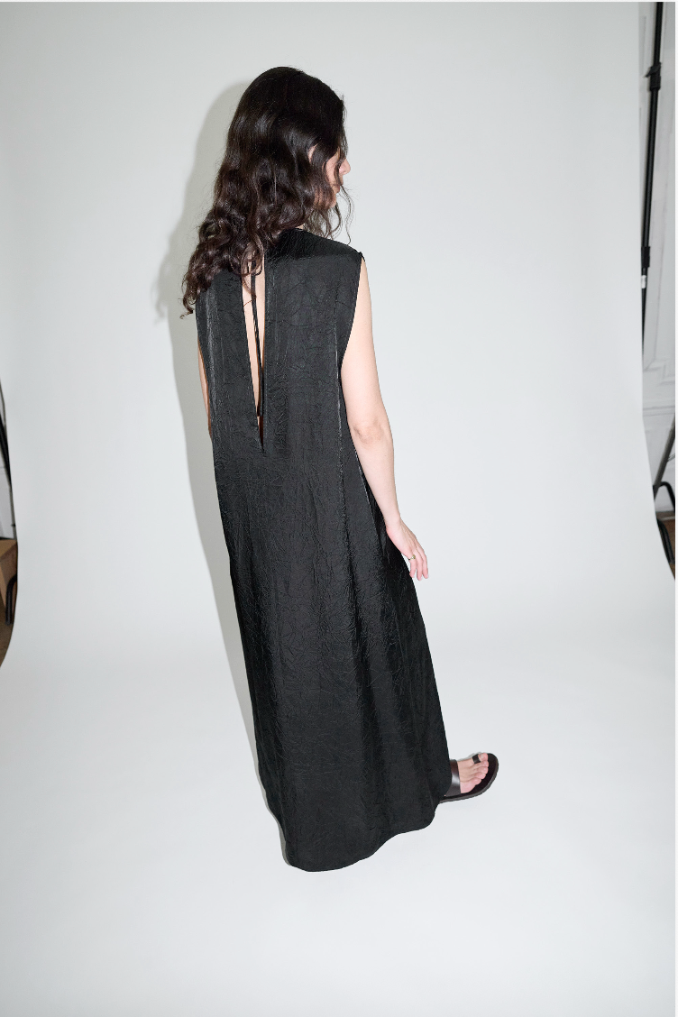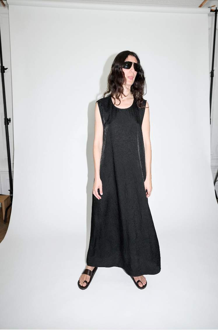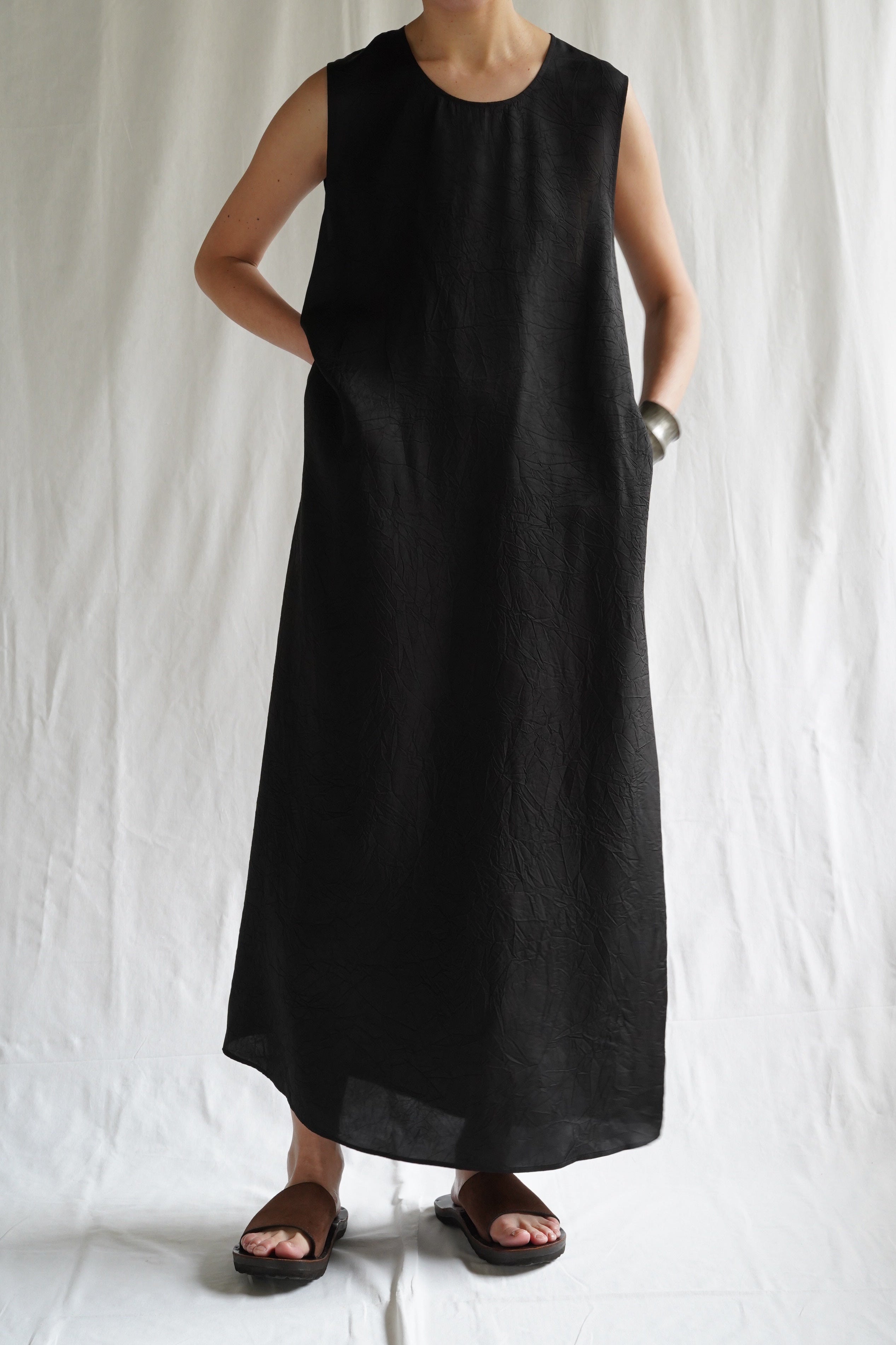 シワ加工を施したキュプラツイル素材を使用。独特のとろみとオチ感のある肌あたりの滑らかな生地で仕立てたブラックロングドレスです。特別なシーンでなくても、丁寧で心豊かな暮らしのデイリーウエアとして。良いものを永く、大切に着るというチョイスを。CRISTASEYAMATERIAL:100%CUPROCOLOR:BLACKSIZE:XS165cm XS