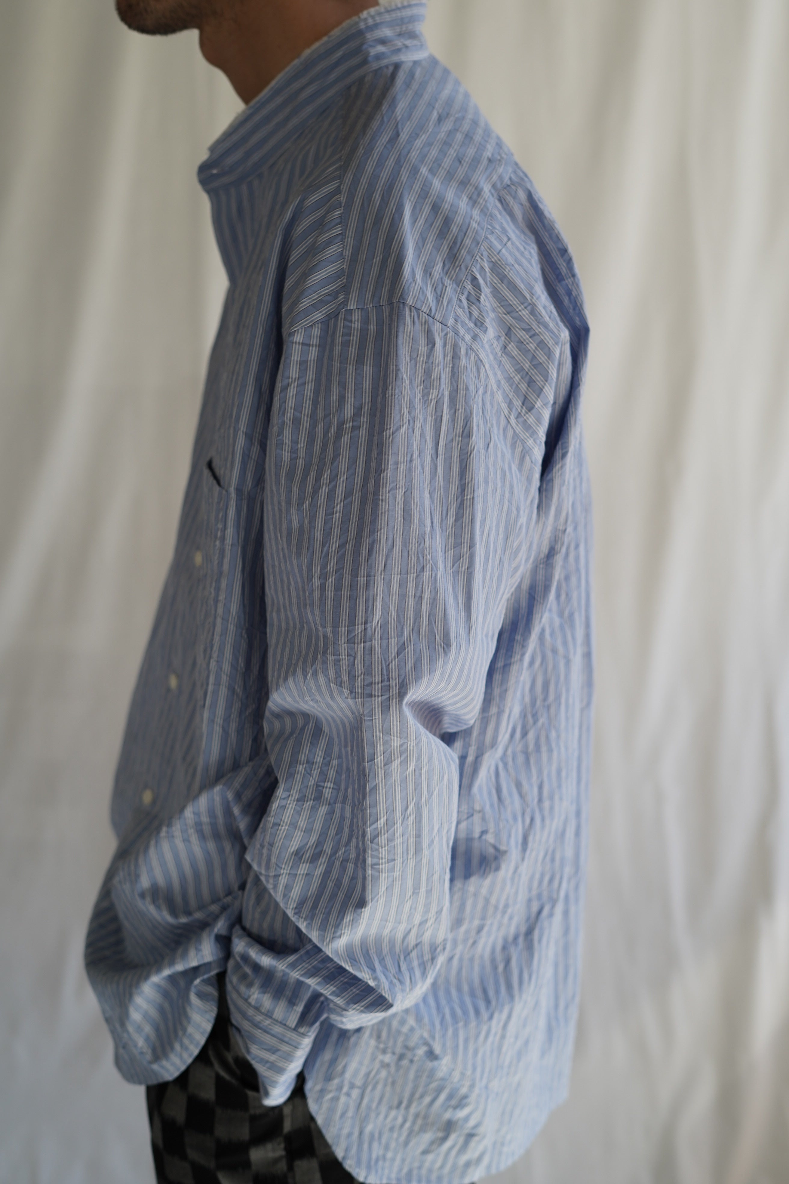 Salvatore PiccoloによるCristaseya別注のアイコニックなフリンジマオカラーシャツです。シワ加工を施したコットンポプリン生地を使用。ハンドスティッチのディテール、上質なファブリックの肌触りなど袖を通すとさらに仕立ての良さを感じられる一枚となっています。Salvatore Piccoloは、カミチェリアとしてスタートしたイタリア、ナポリのブランド。伝統的な仕立てと上質な生地を使い、Cristaseyaのエッセンスを加えたシャツは、男女問わずぜひ袖を通して体感いただきたいスペシャルな一着です。