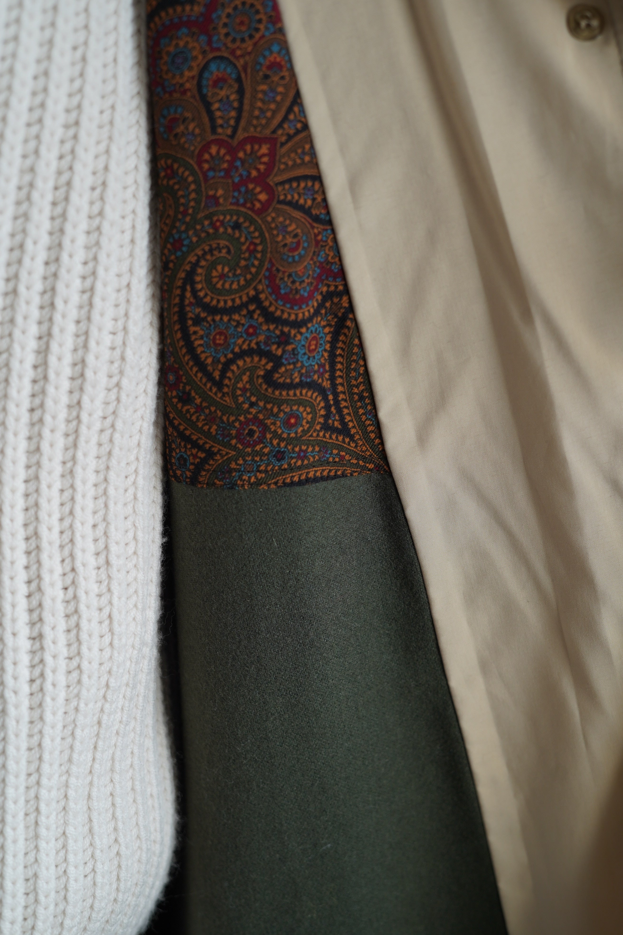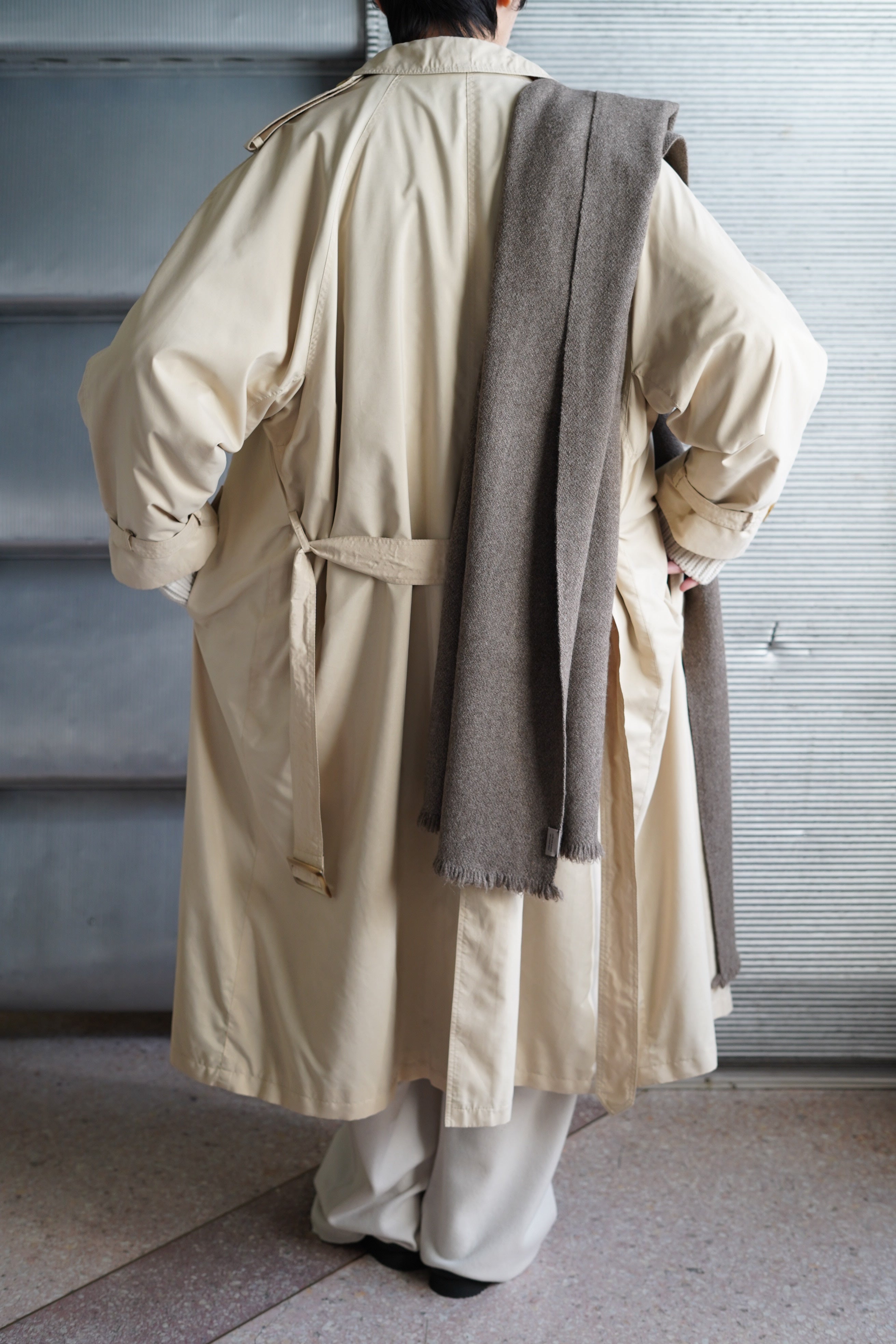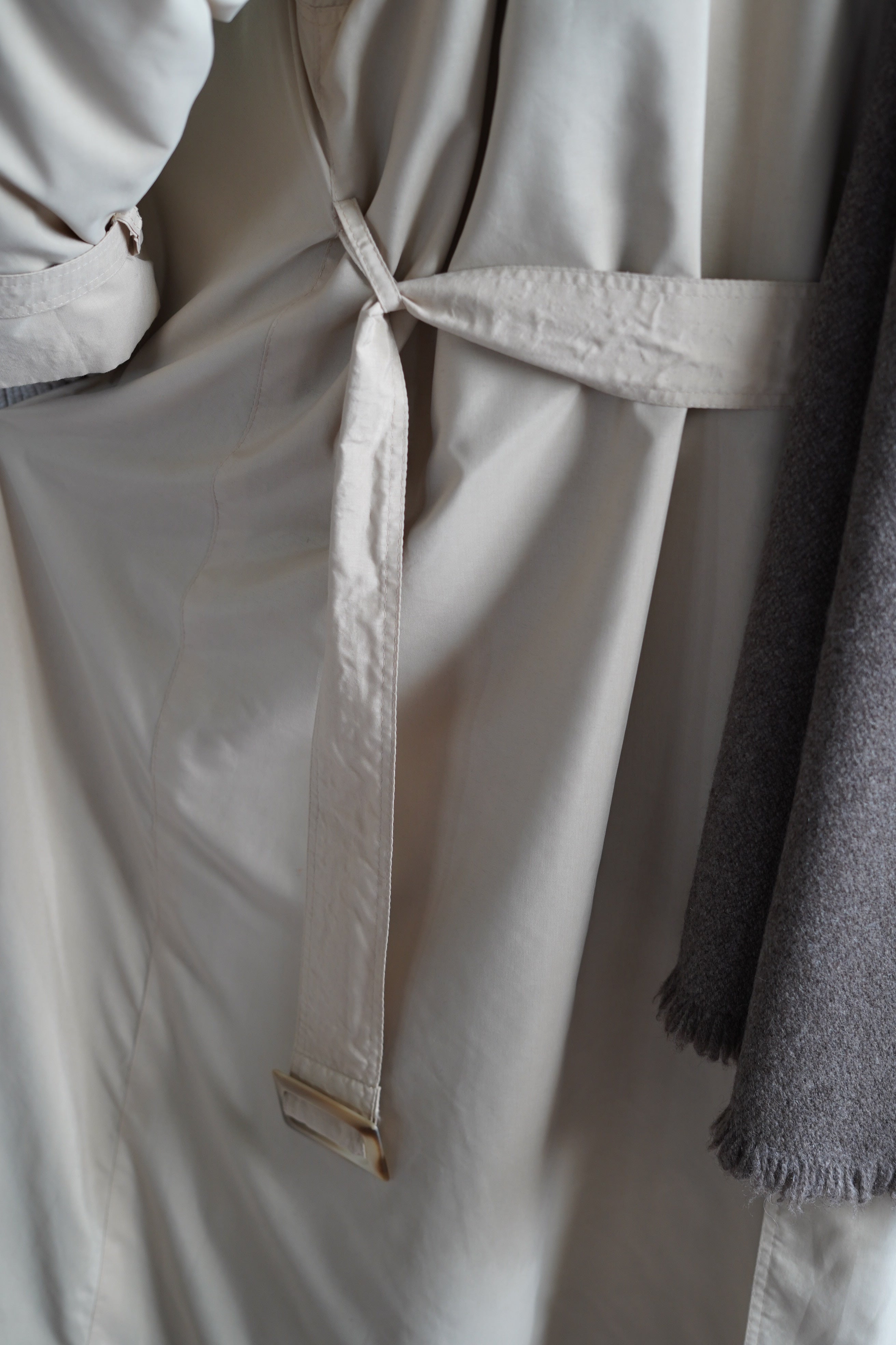 イタリアで見つけたベーシックなシングルトレンチコートです。明るめのベージュトーンで、裏地はペイズリー柄と下半分は起毛素材のライナーとなっています。秋〜春先のコートとして、今の時期は暖かなニットを一枚重ねて、上から大判のストールなどを巻けばちょうど良いです。軽さがありさっと手に取りたくなる一枚です。
