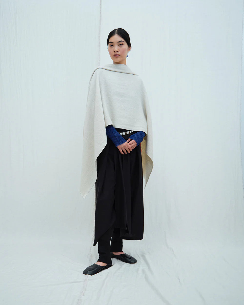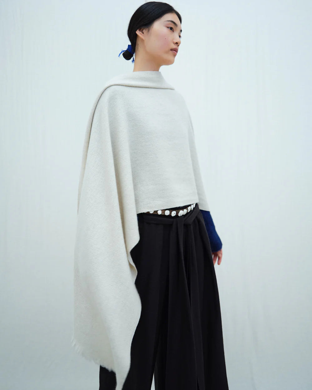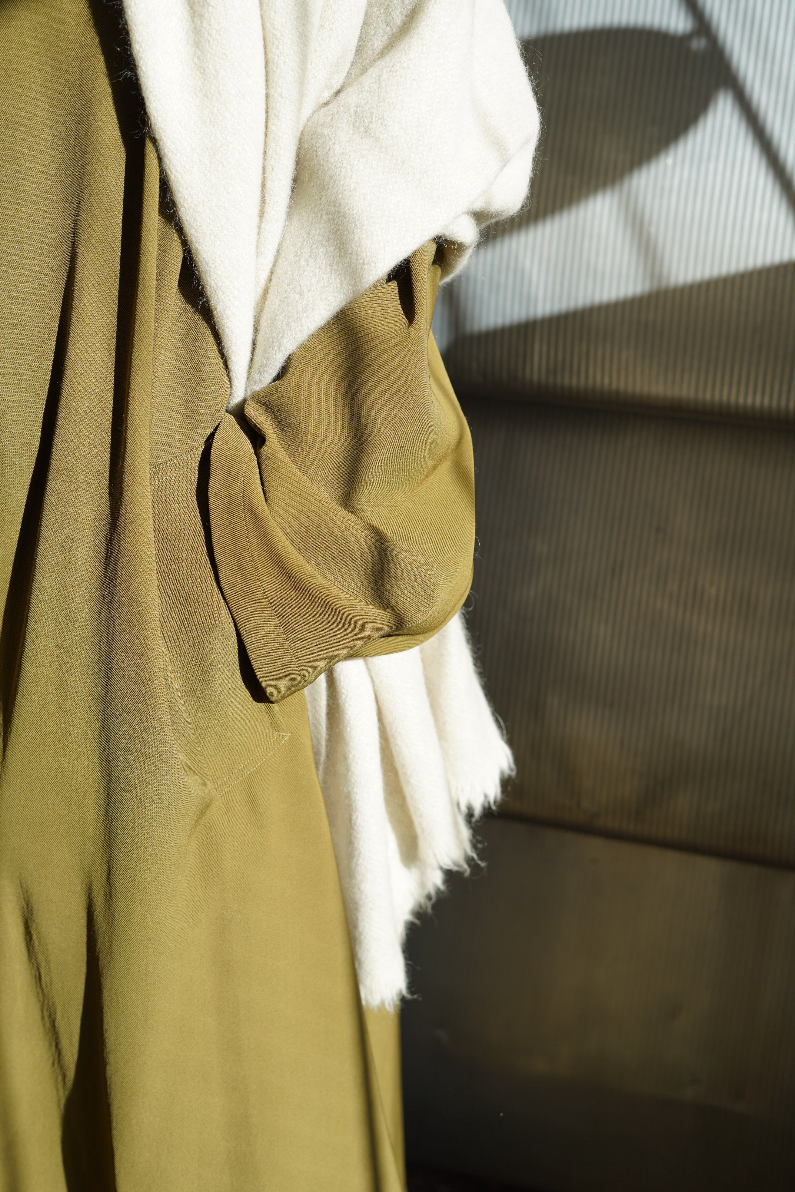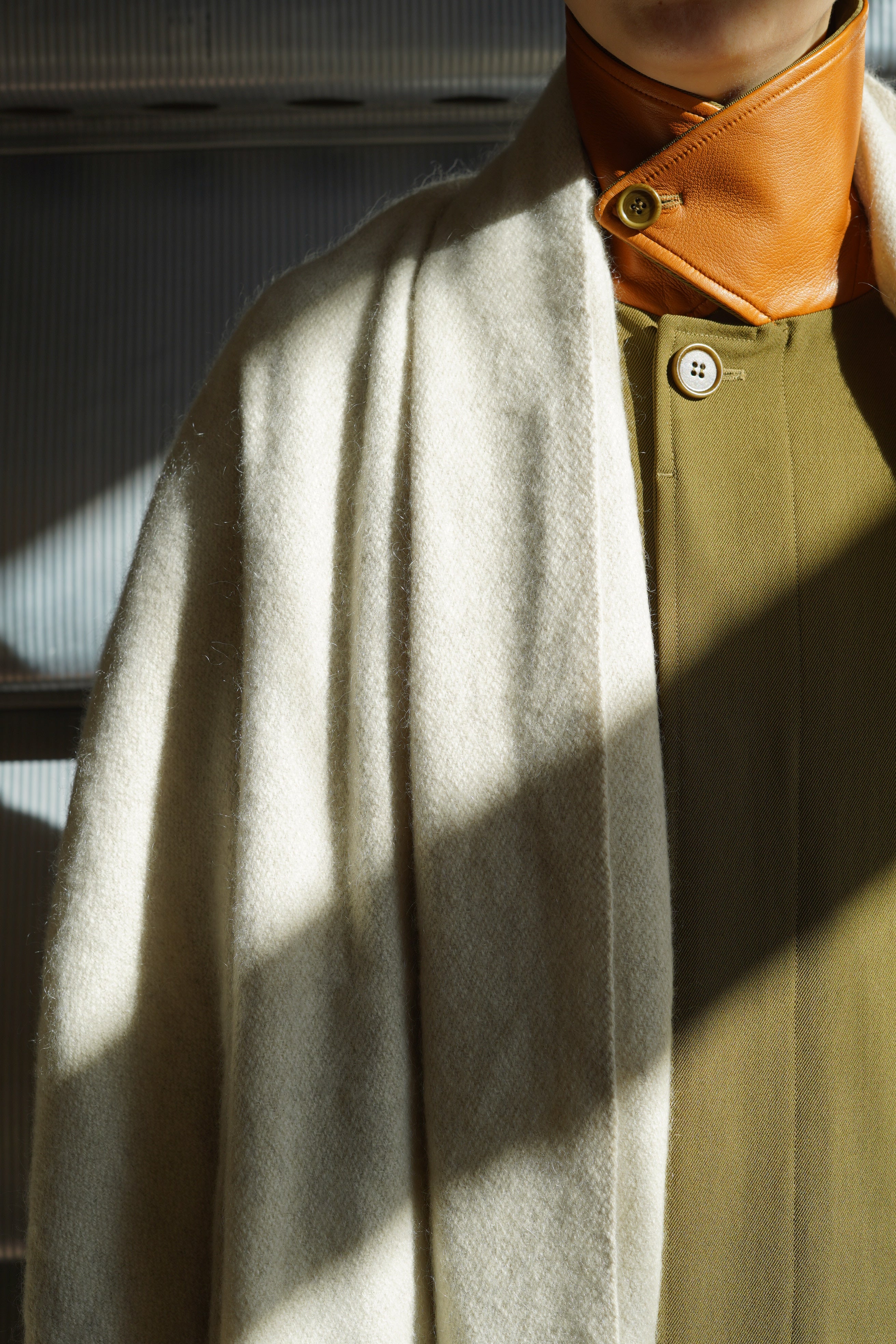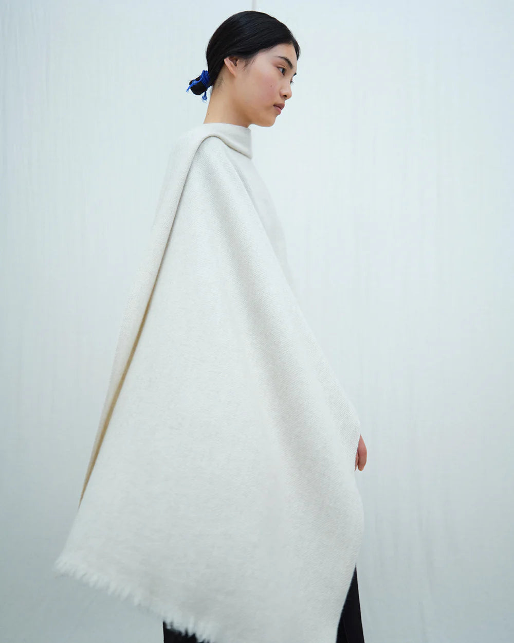 About Yak Khullu:このスカーフには、5頭分のヤクから採取された希少なクル(産毛)を使用しています。クルとは、チベットの厳しい冬の寒さからヤクの身体を守る、極めて細く柔らかな下毛のことです。夏になるとヤクが自然に脱ぎ落とす毛を、一房ずつ職人が丁寧に手作業で採取しています。 Artisans & Processes: このスカーフは、ノラ・アトリエに所属する14名の職人によって丁寧に作られています。制作には12の専門的な工程があり、いずれも高度な技術と細やかな手仕事が求められます。