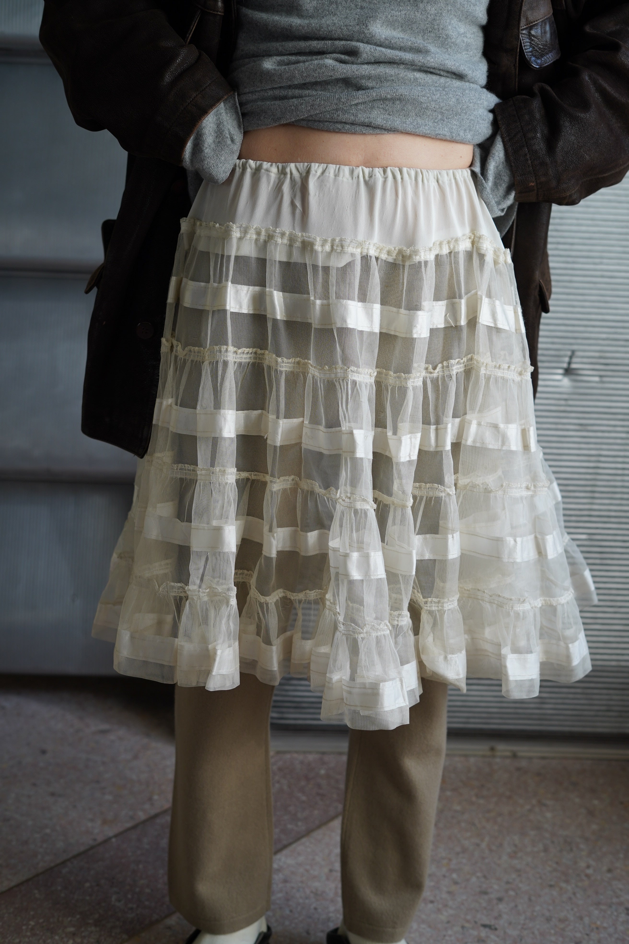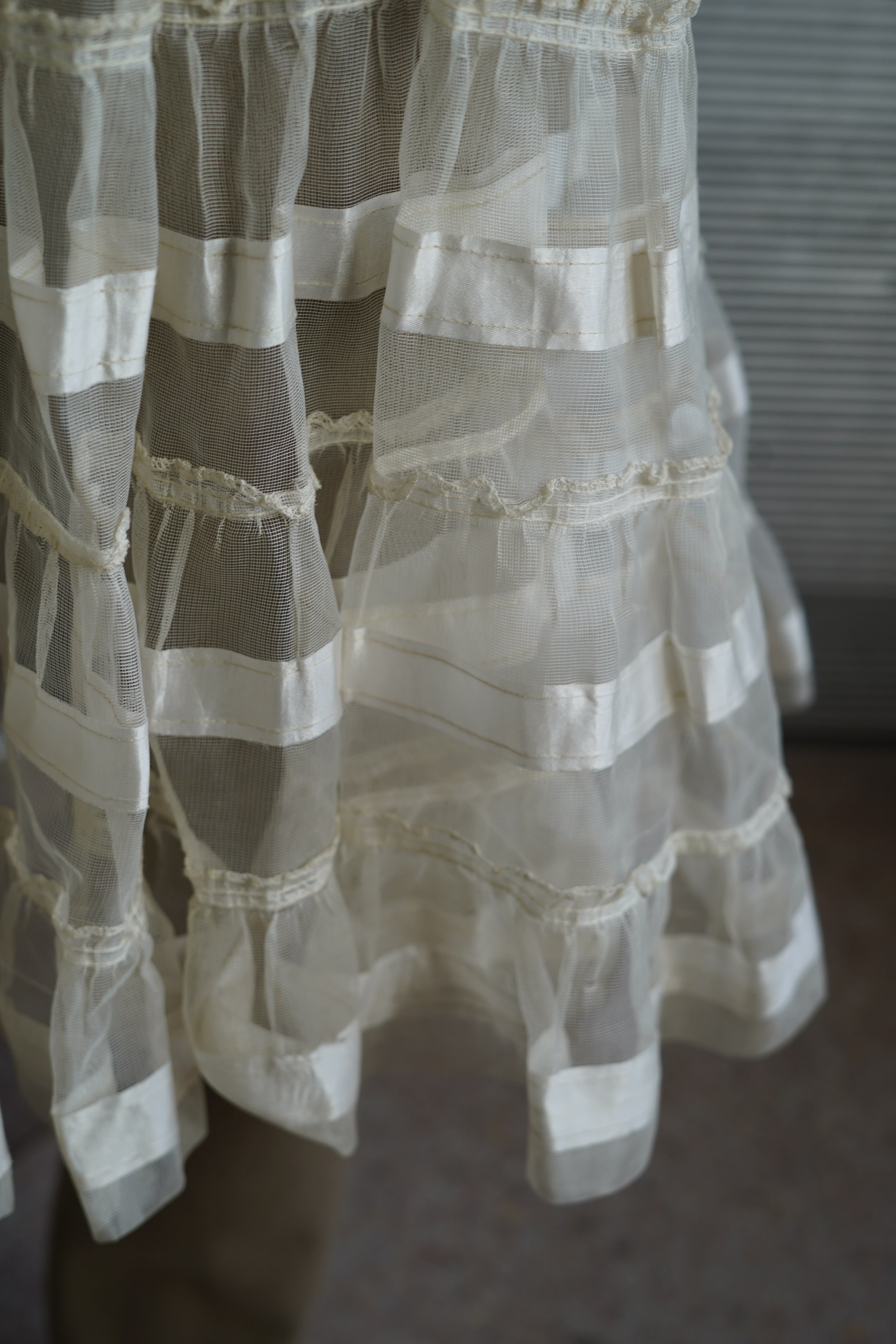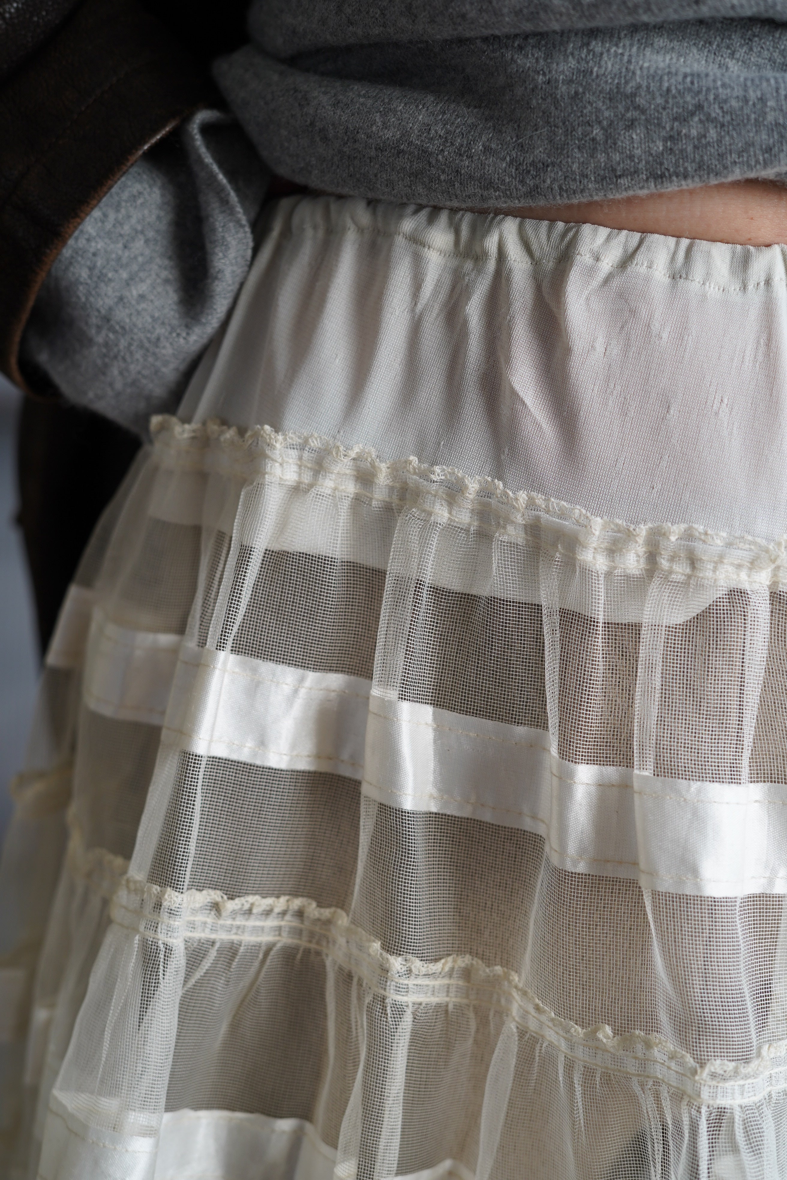チュールリボンのボリューム感のあるシアーなスカートです。ボトムの上から重ねたり、ペチコートとしてスカートやミニドレスなどの下に合わせて楽しむのがおすすめです。透け感を生かしたスタイリングをお楽しみください。VINTAGEYear:1930SCountry: BelgiumMaterial: 表記なし(NYLON)Size: FREE ウエスト最大約47cm(※ゴム),総丈 約57mMODEL 165cmCondition:全体的に年代相当のヴィンテージコンディションです。すべて着用し際して差し支えのない範囲となります。こちらのアイテムの個性、雰囲気としてご理解ください。