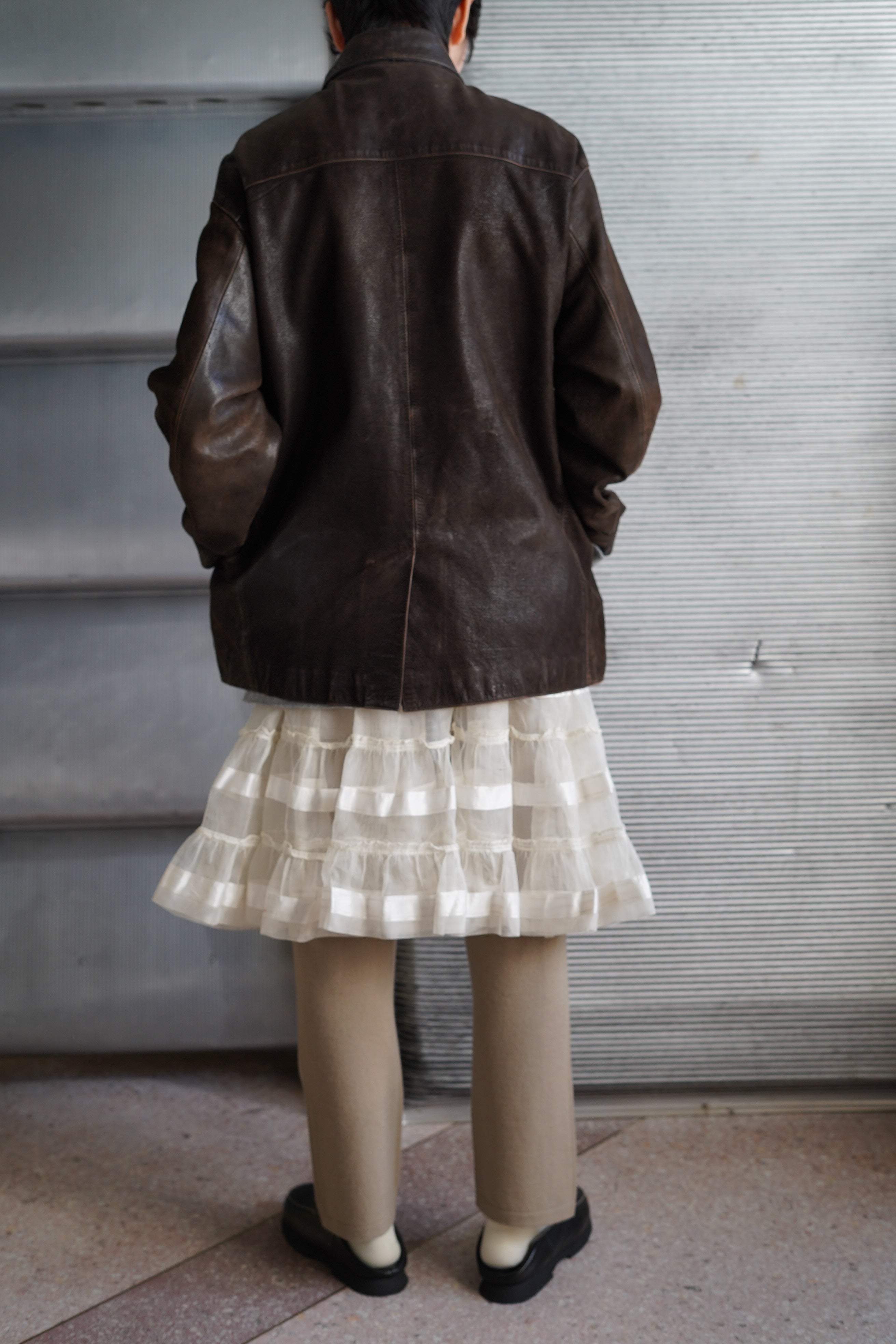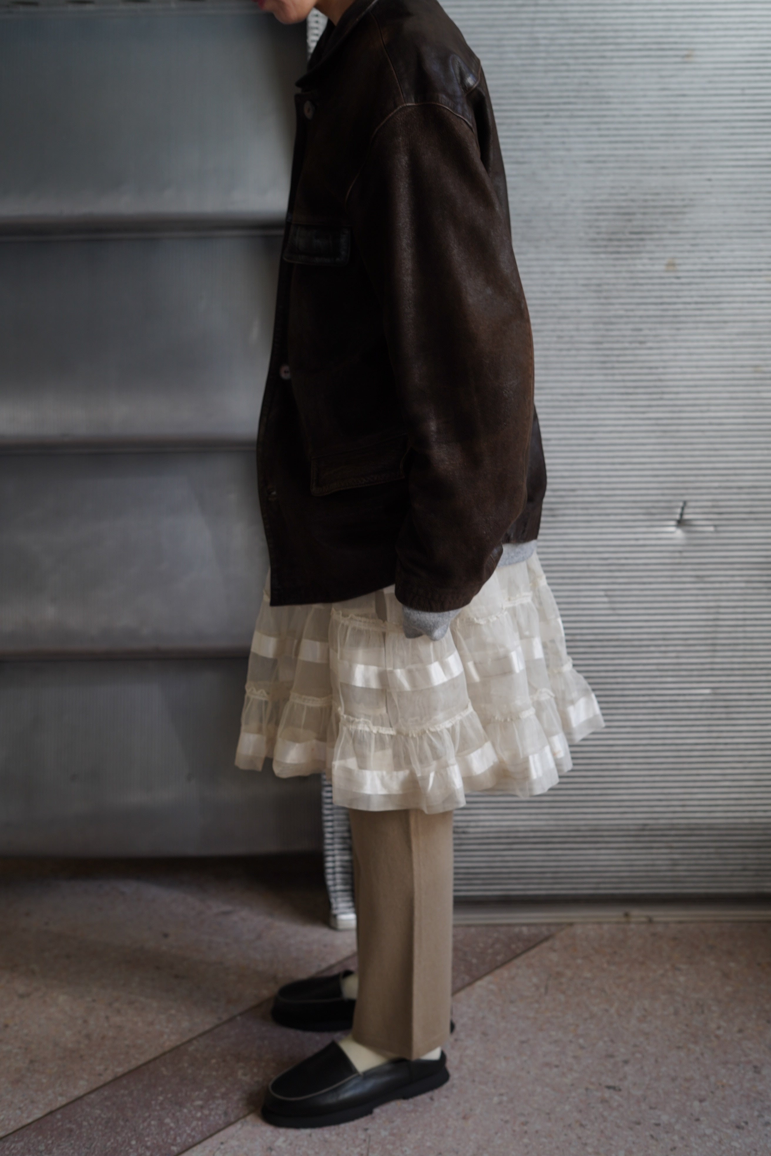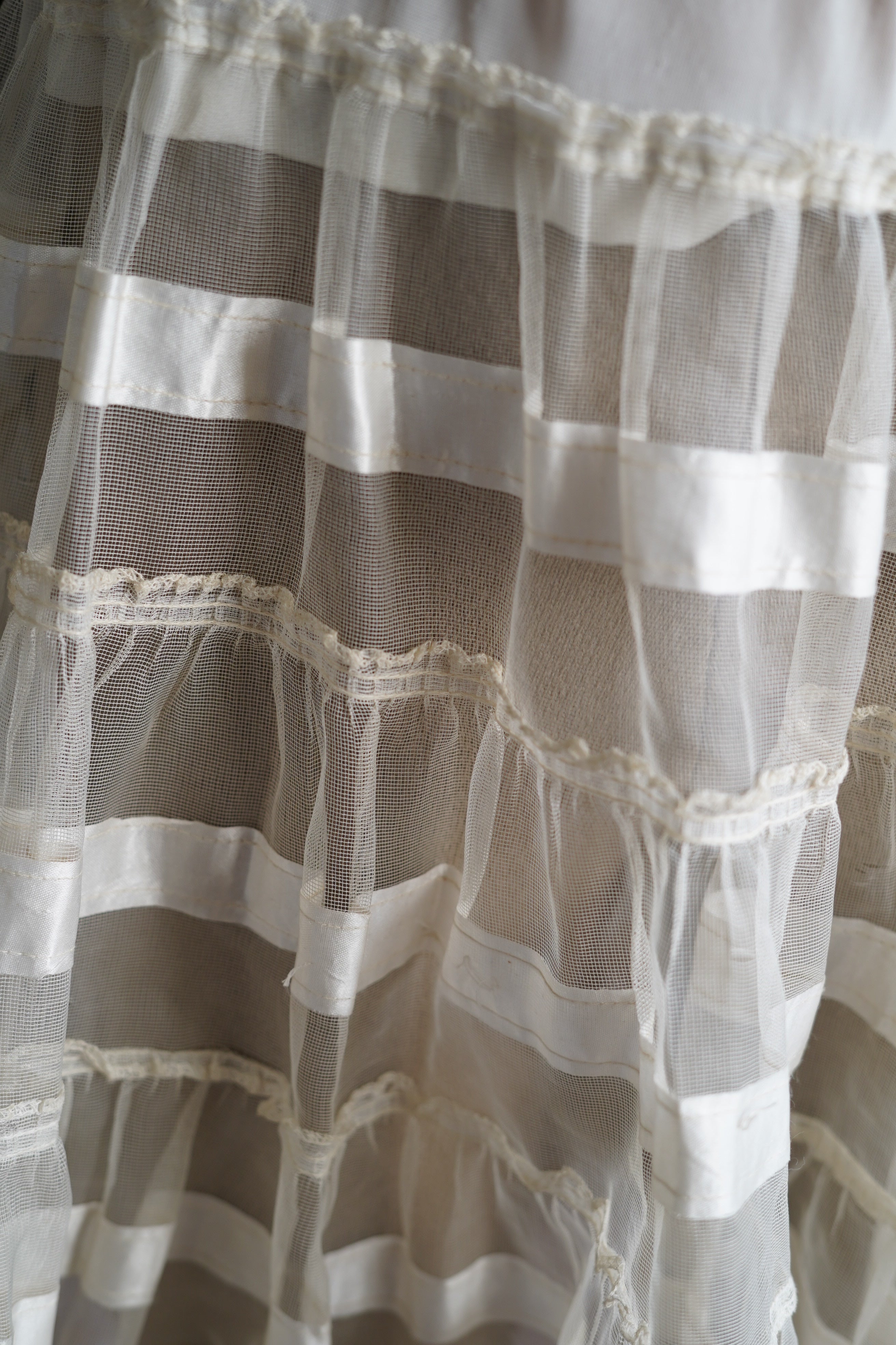 チュールリボンのボリューム感のあるシアーなスカートです。ボトムの上から重ねたり、ペチコートとしてスカートやミニドレスなどの下に合わせて楽しむのがおすすめです。透け感を生かしたスタイリングをお楽しみください。VINTAGEYear:1930SCountry: BelgiumMaterial: 表記なし(NYLON)Size: FREE ウエスト最大約47cm(※ゴム),総丈 約57mMODEL 165cmCondition:全体的に年代相当のヴィンテージコンディションです。すべて着用し際して差し支えのない範囲となります。こちらのアイテムの個性、雰囲気としてご理解ください。