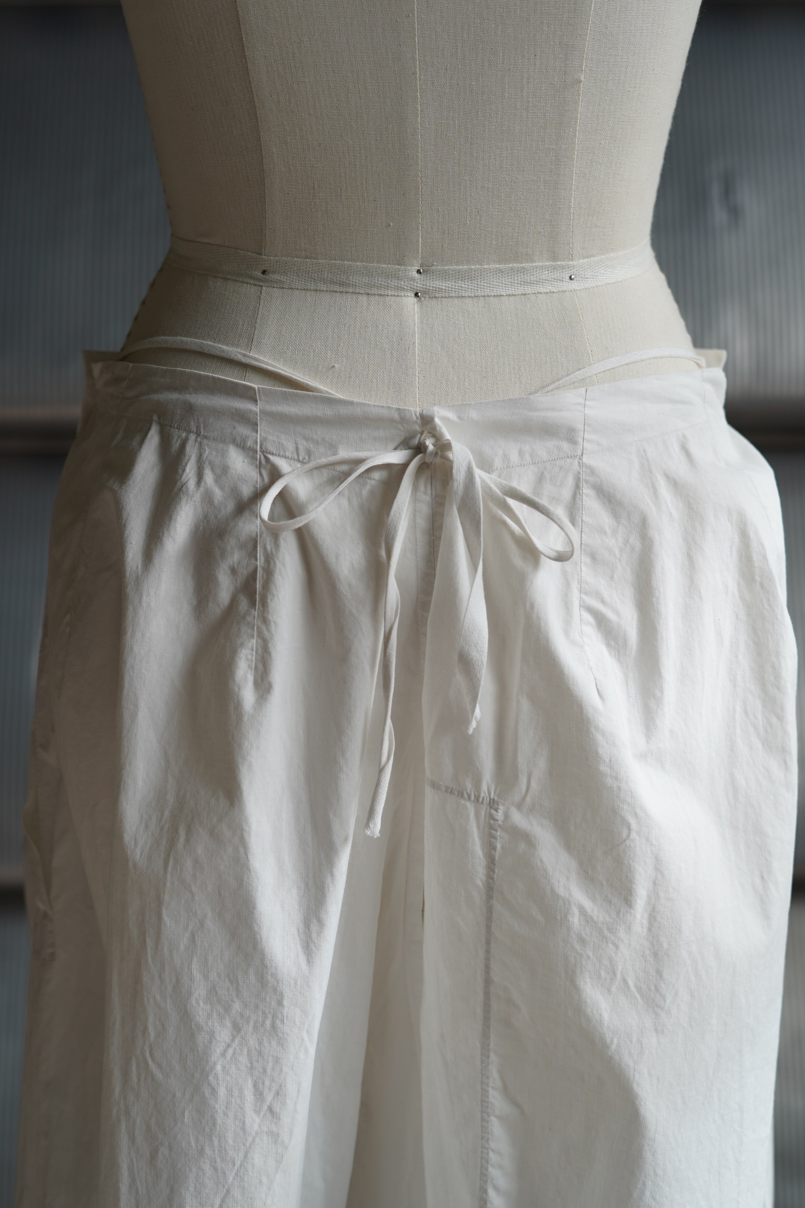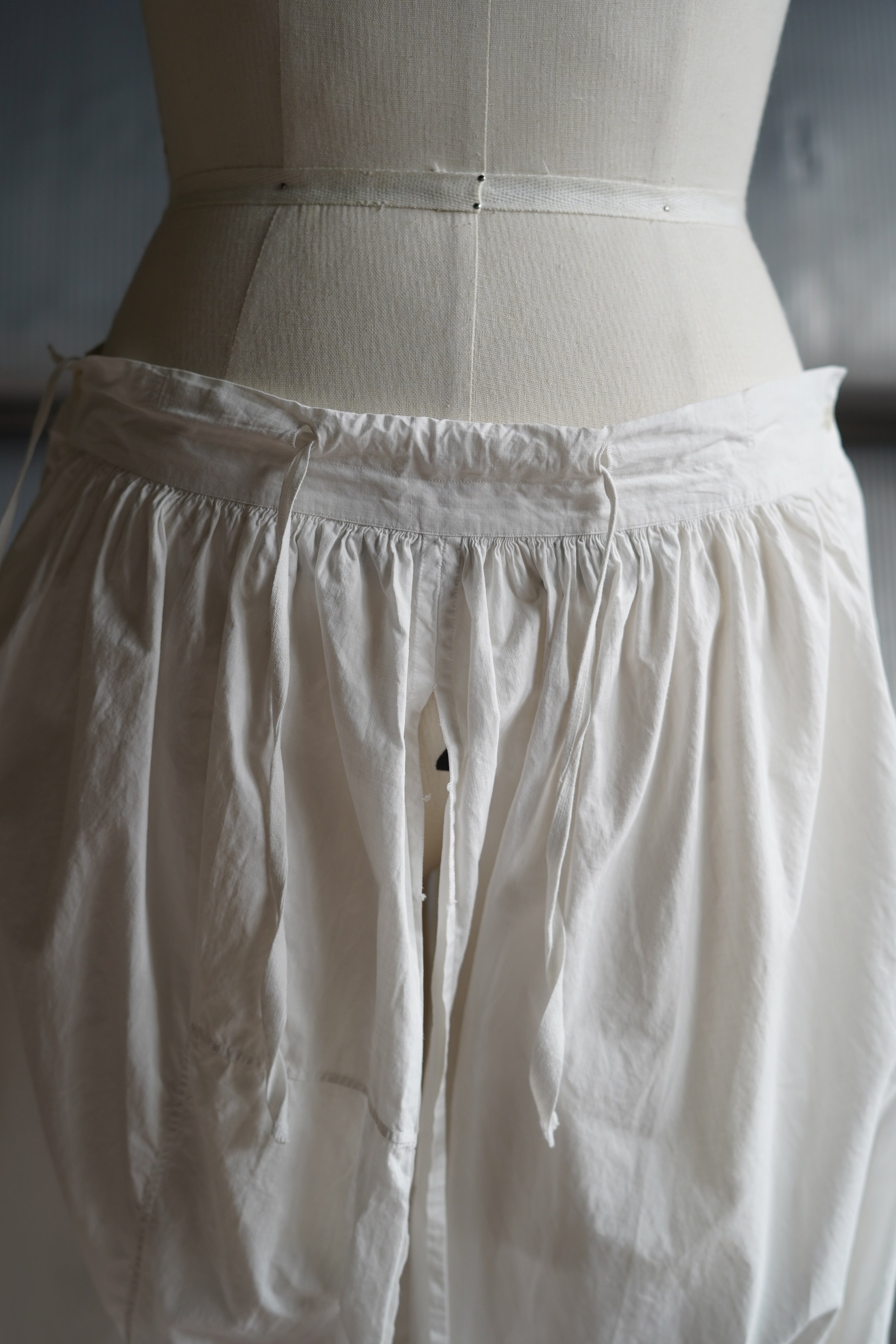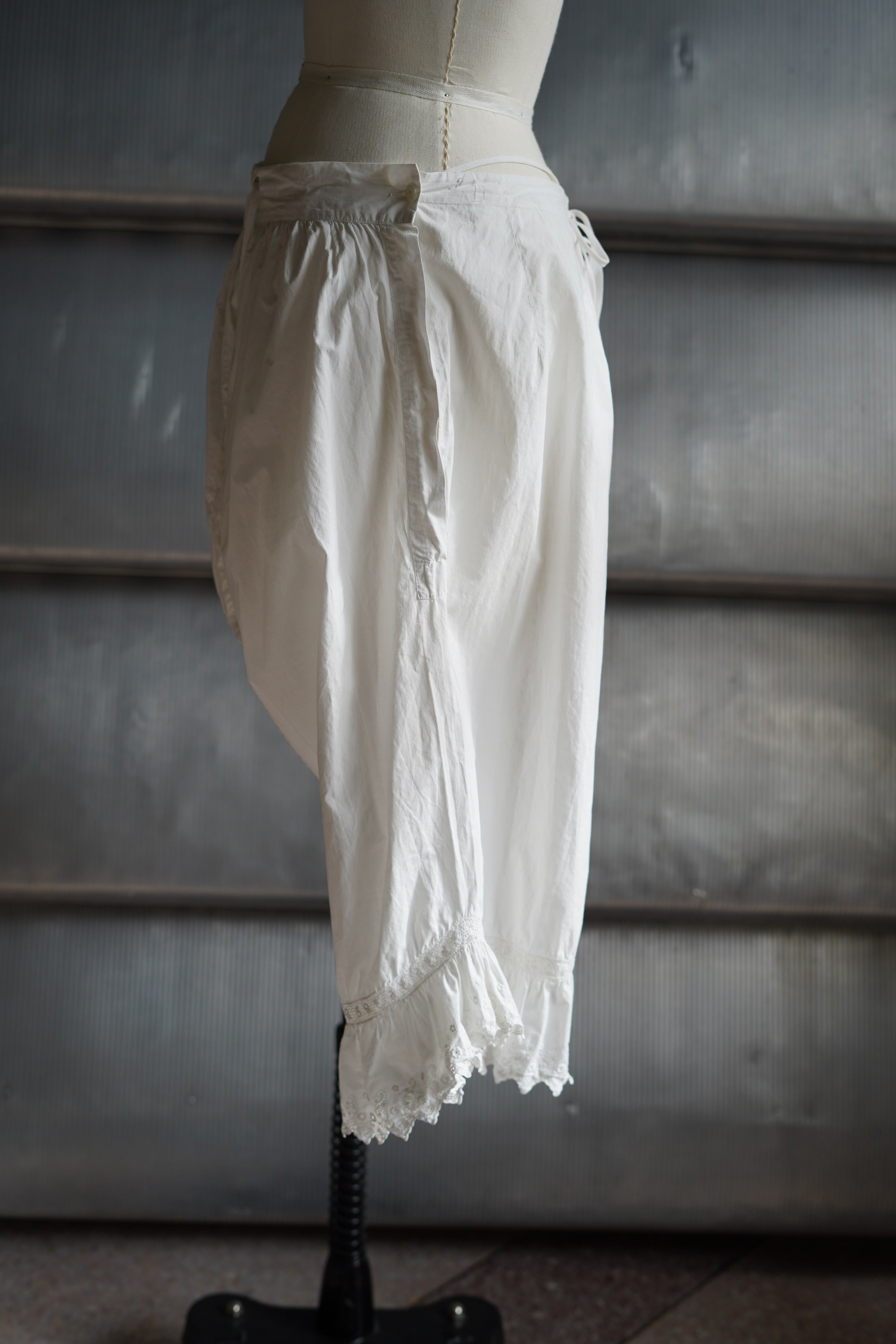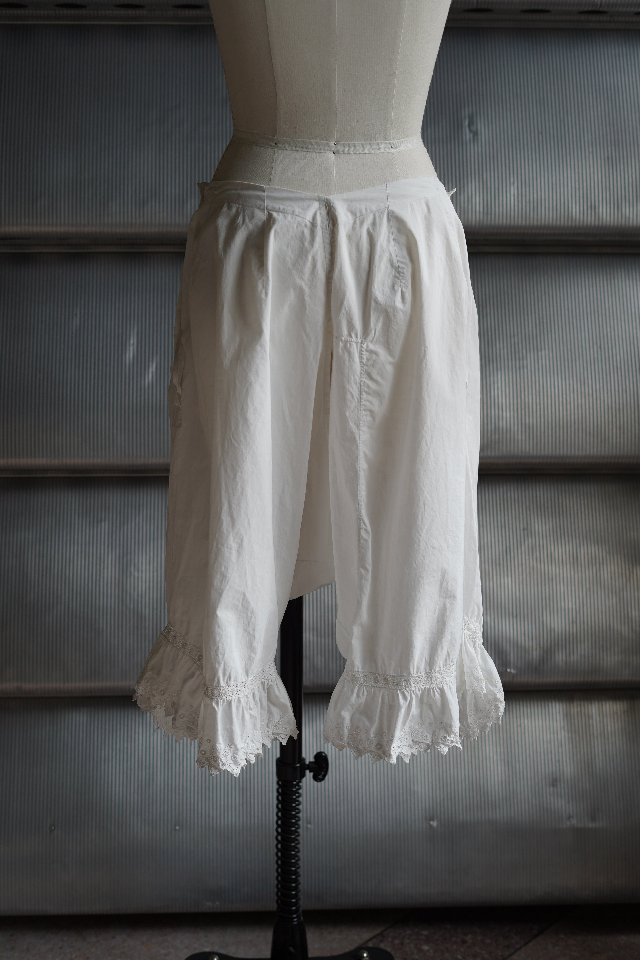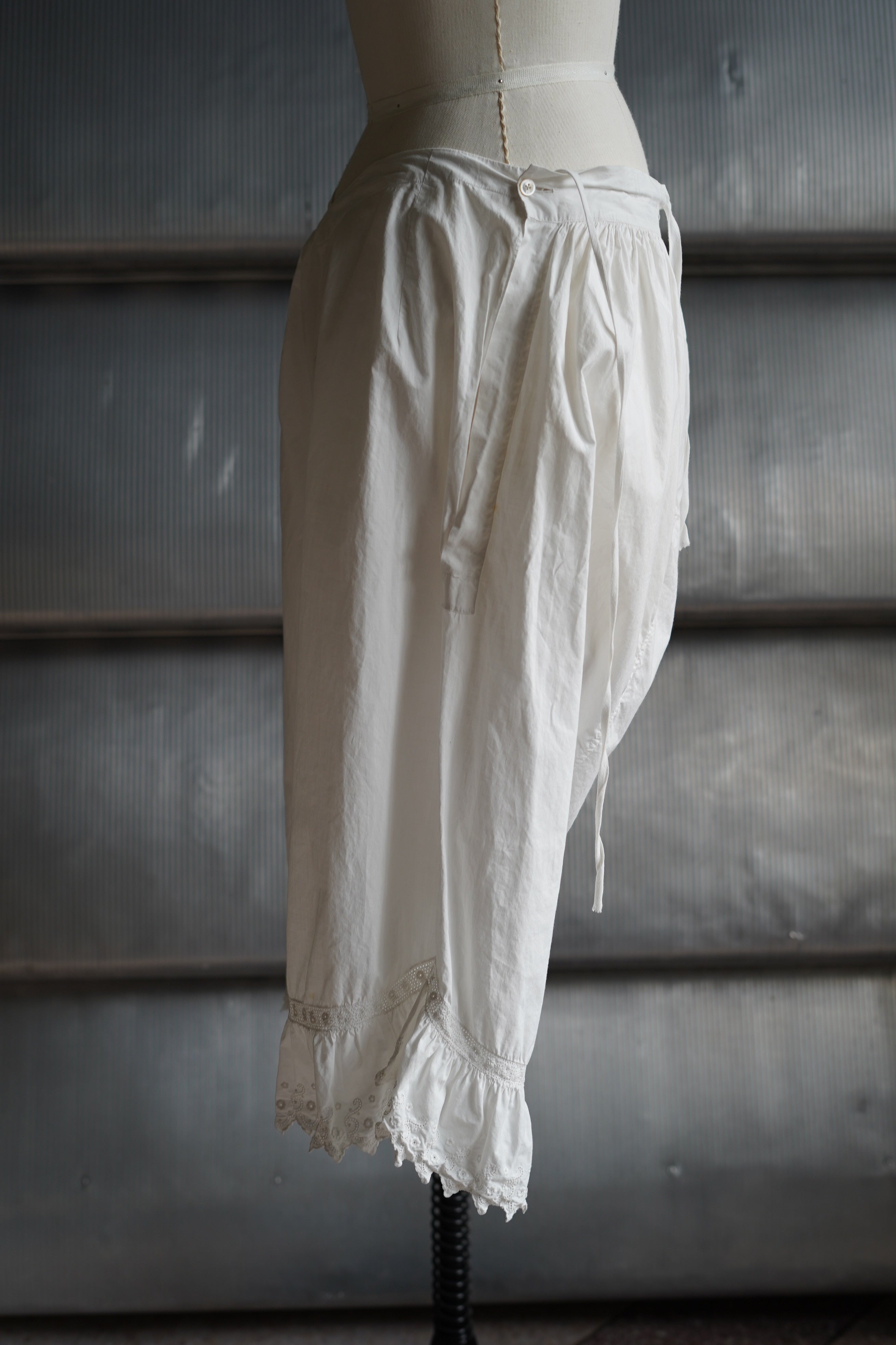 女性の自由なスタイルの立役者として1920年ごろから登場するknickersというアンダーウエアです。こちらのタイプは股が前後に大きく開いたより古い年代の一枚です。オーバーパンツとしてボトムの上から重ねたり、裾のフリルを見せてミニドレスなどの下に合わせて楽しむのがおすすめです。透け感のあるアイテムのインナーとしても活躍します。VINTAGEYear:1920SCountry:FranceMaterial: 表記なし(COTTON)Size: FREE ウエスト約34~39.5cm(※紐で縛ることが可能),総丈 約65m,股下レース含む34cm,内股スリット32cmMODEL 165cmCondition:前の股部分にややステッチの裂けあり。その他、全体的に年代相当のヴィンテージコンディションです。すべて着用し際して差し支えのない範囲となります。こちらのアイテムの個性、雰囲気としてご理解ください。