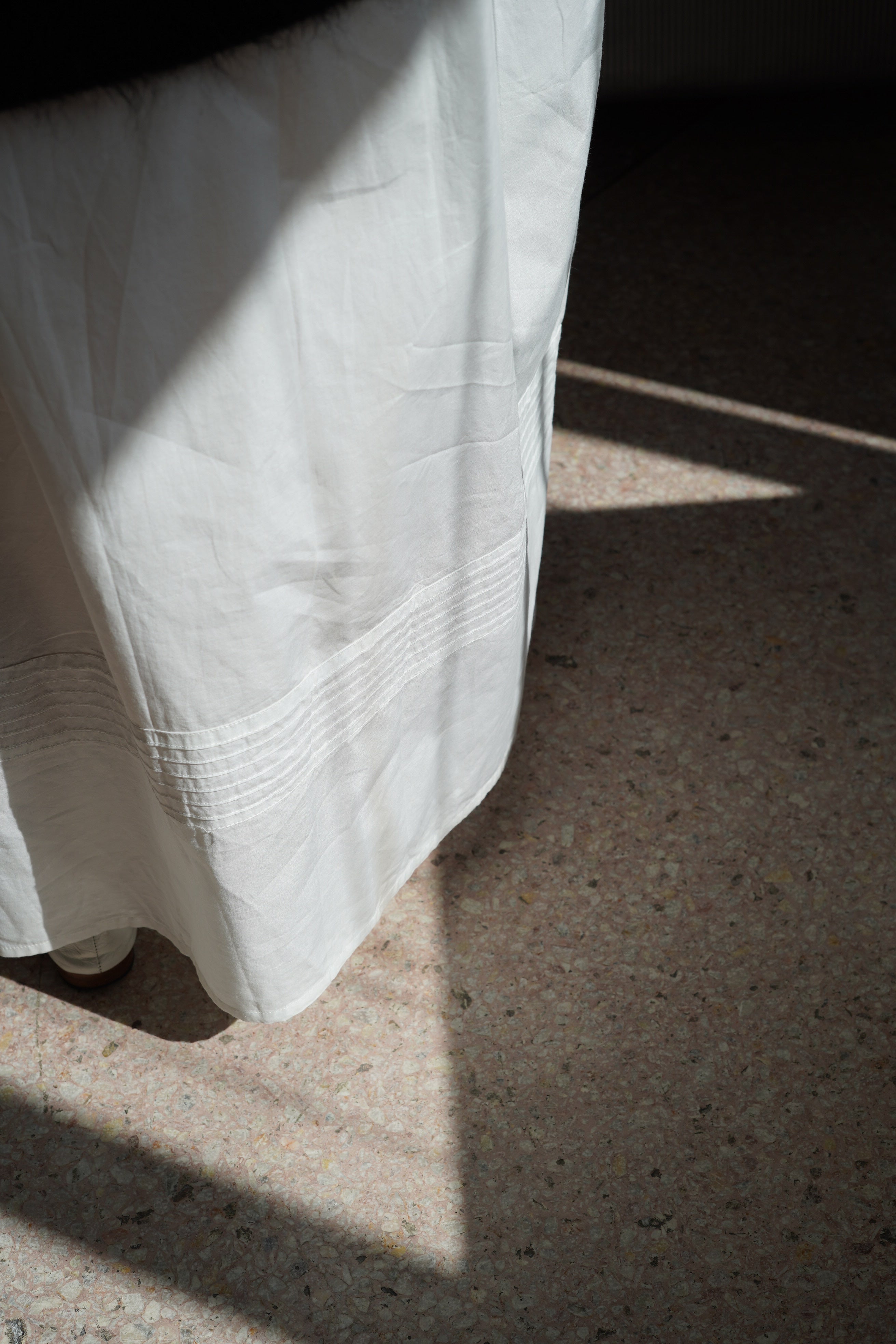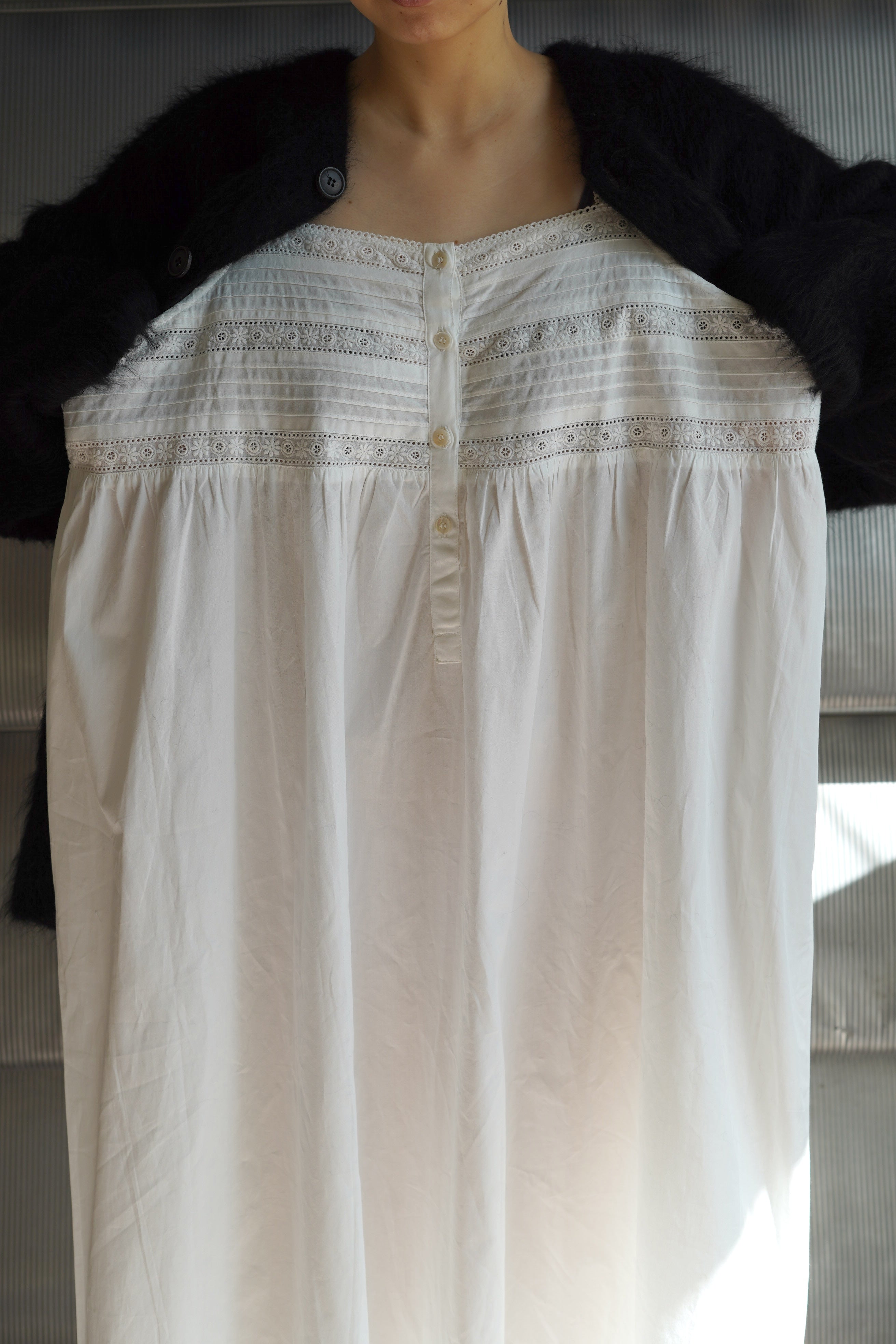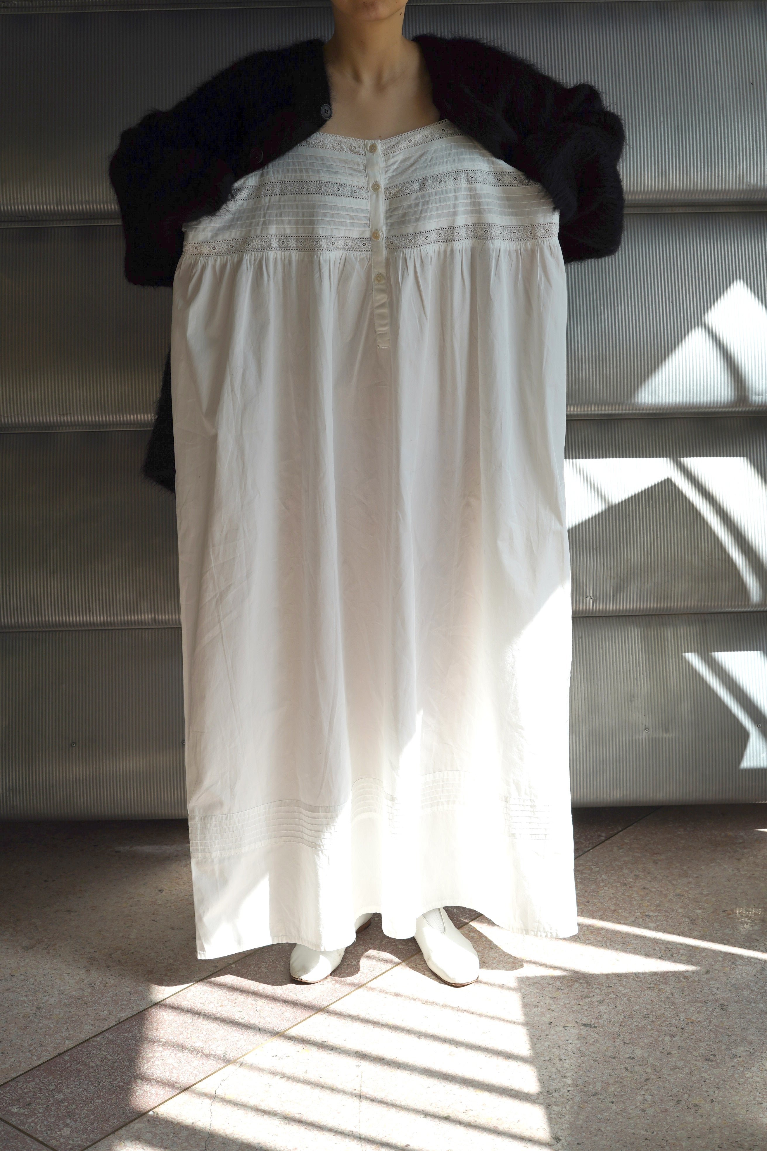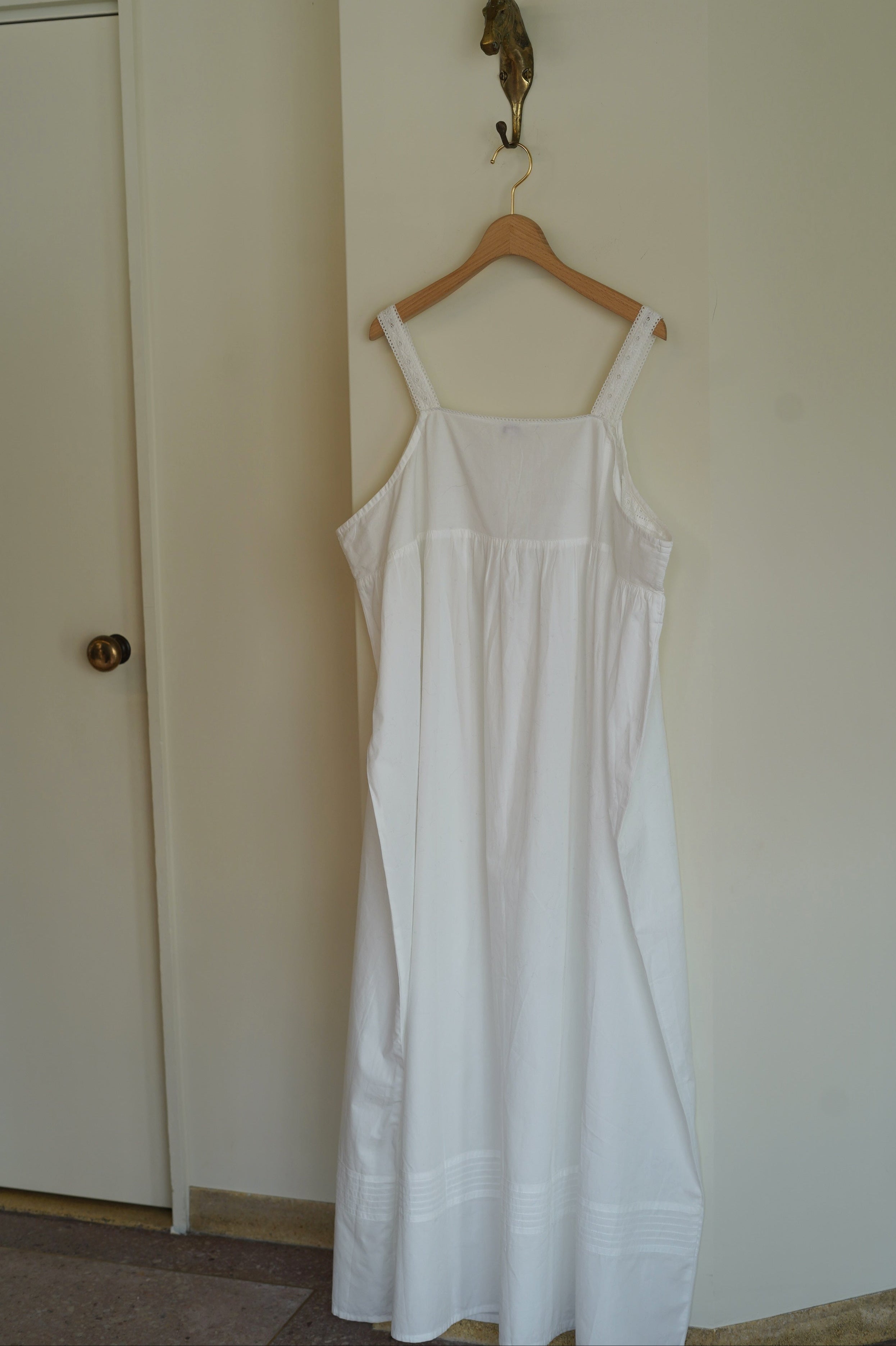 たっぷりとした身幅のロングドレスです。キャミソールタイプなので色々なバランスでレイヤードをお楽しみいただきたい一枚。寒くなったら温もりのあるニットとすこしファニーなバランスもおすすめです。VINTAGEYear:circa 80sCountry:unknownMaterial: 表記なし(COTTON)Size:身幅約62cm,肩紐14cm,着丈約133cmMODEL 160cmCondition:全体的に年代相当の良好なコンディションです。後ろ身頃裾から15cmあたりの部分にうっすらと黒っぽい汚れあり。 こちらの商品は、古着ならではの風合いや経年変化がございます。その特性をご理解のうえお楽しみいただけるお客様におすすめしております。