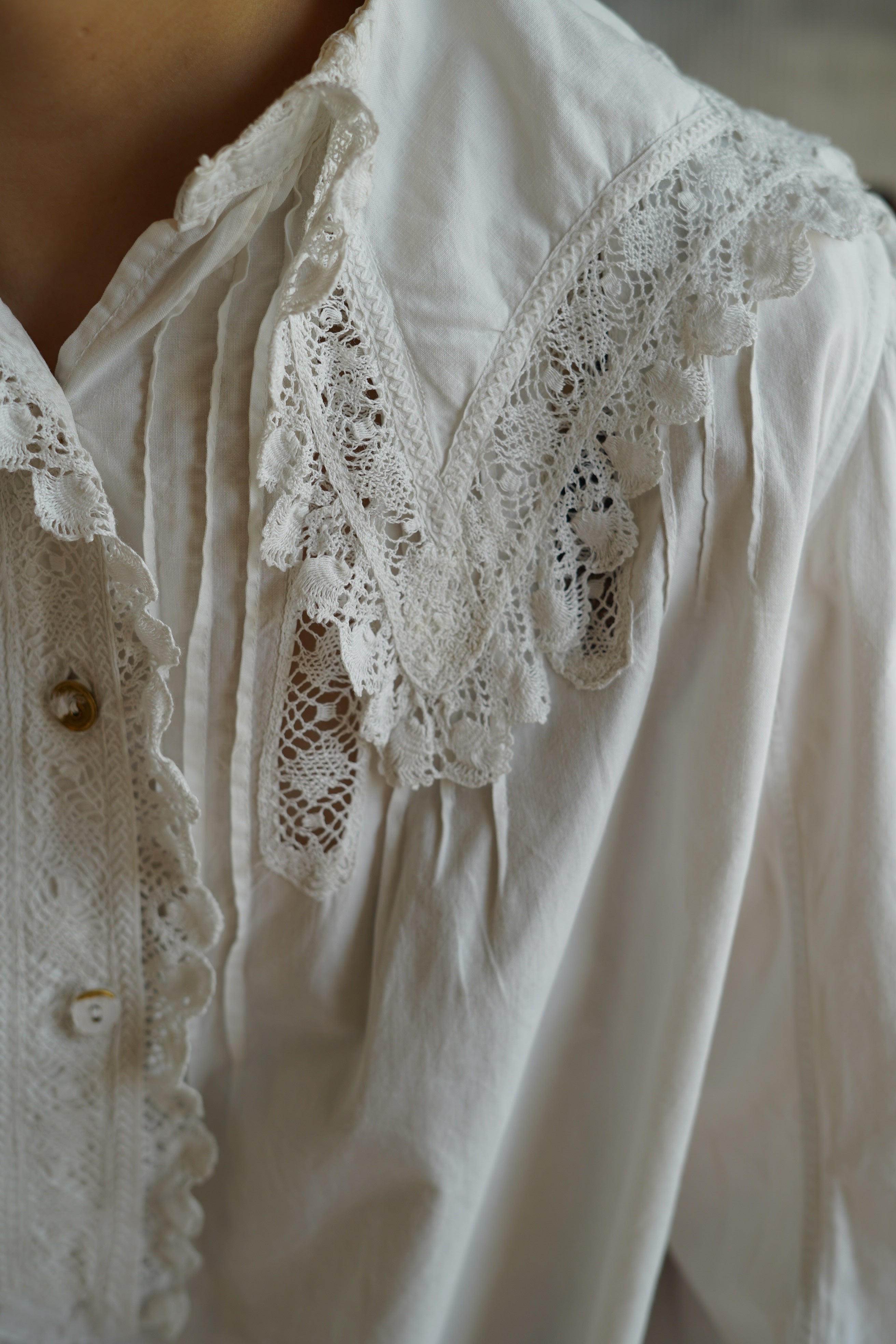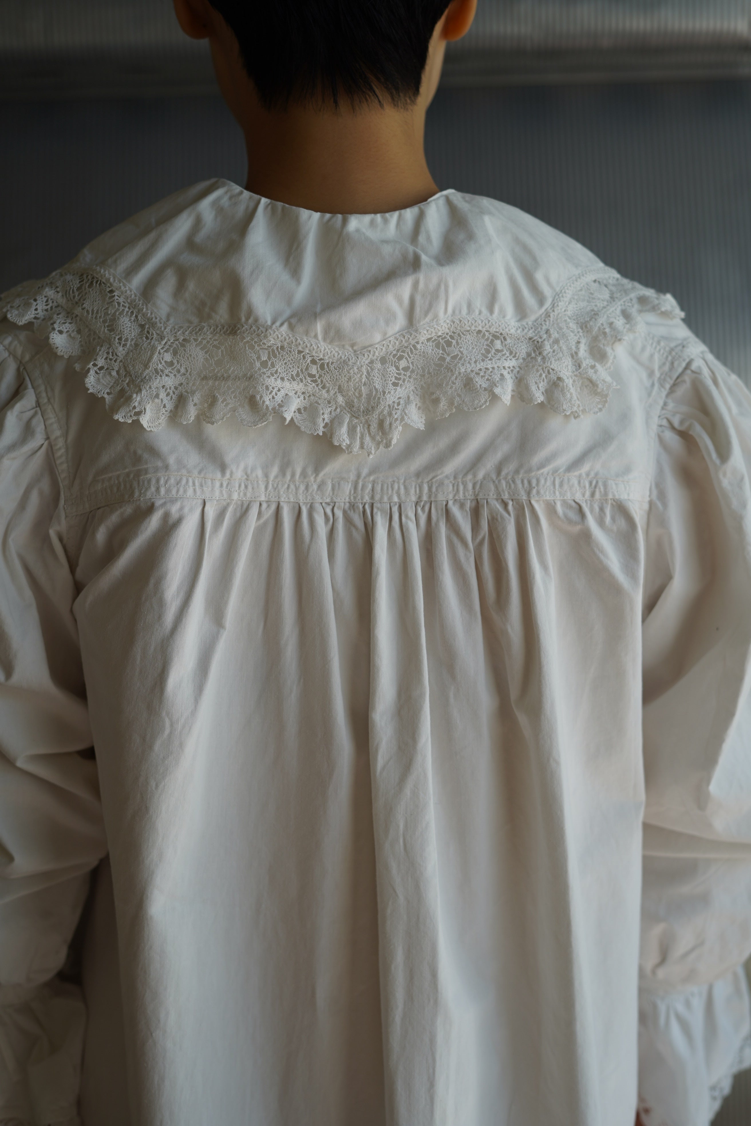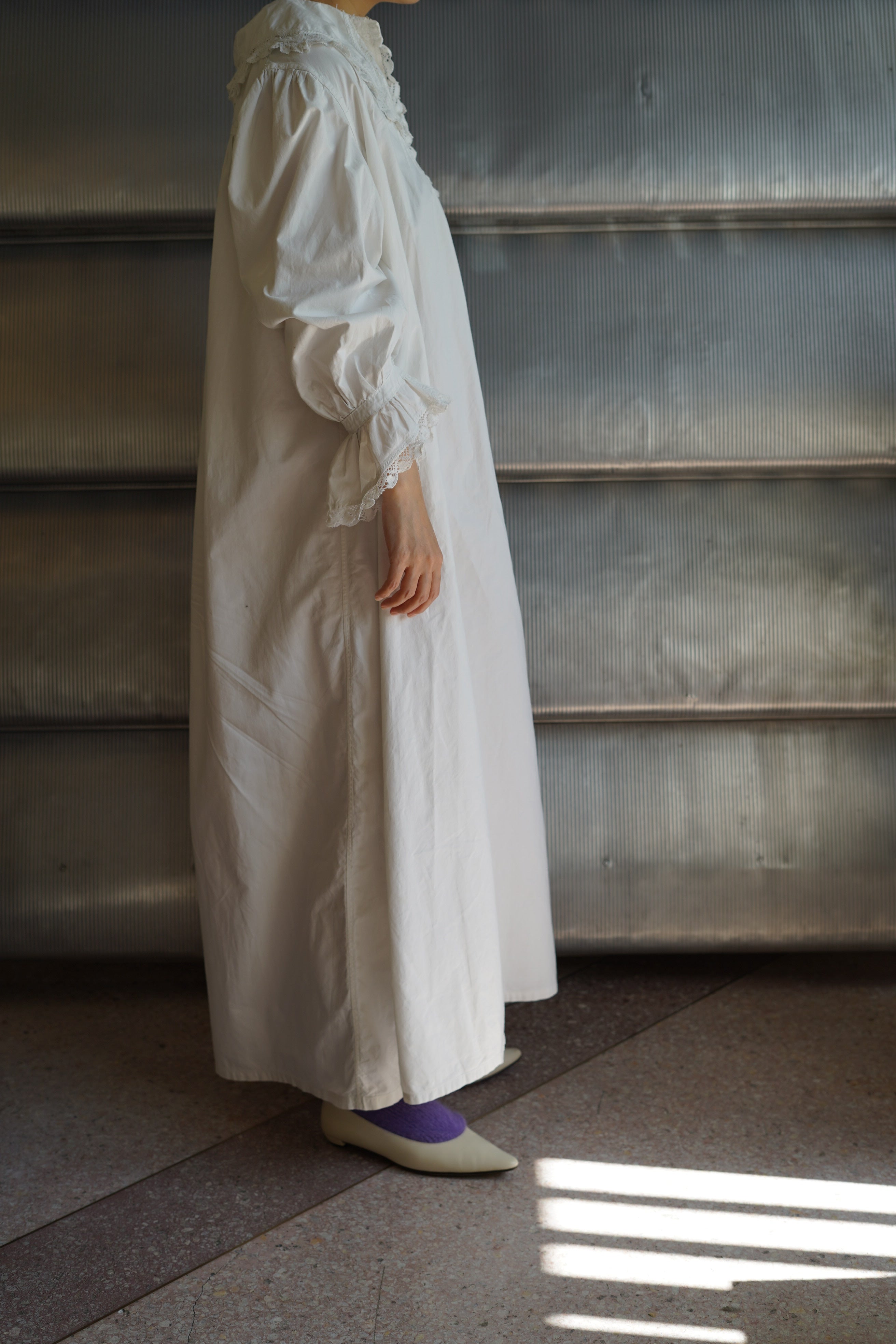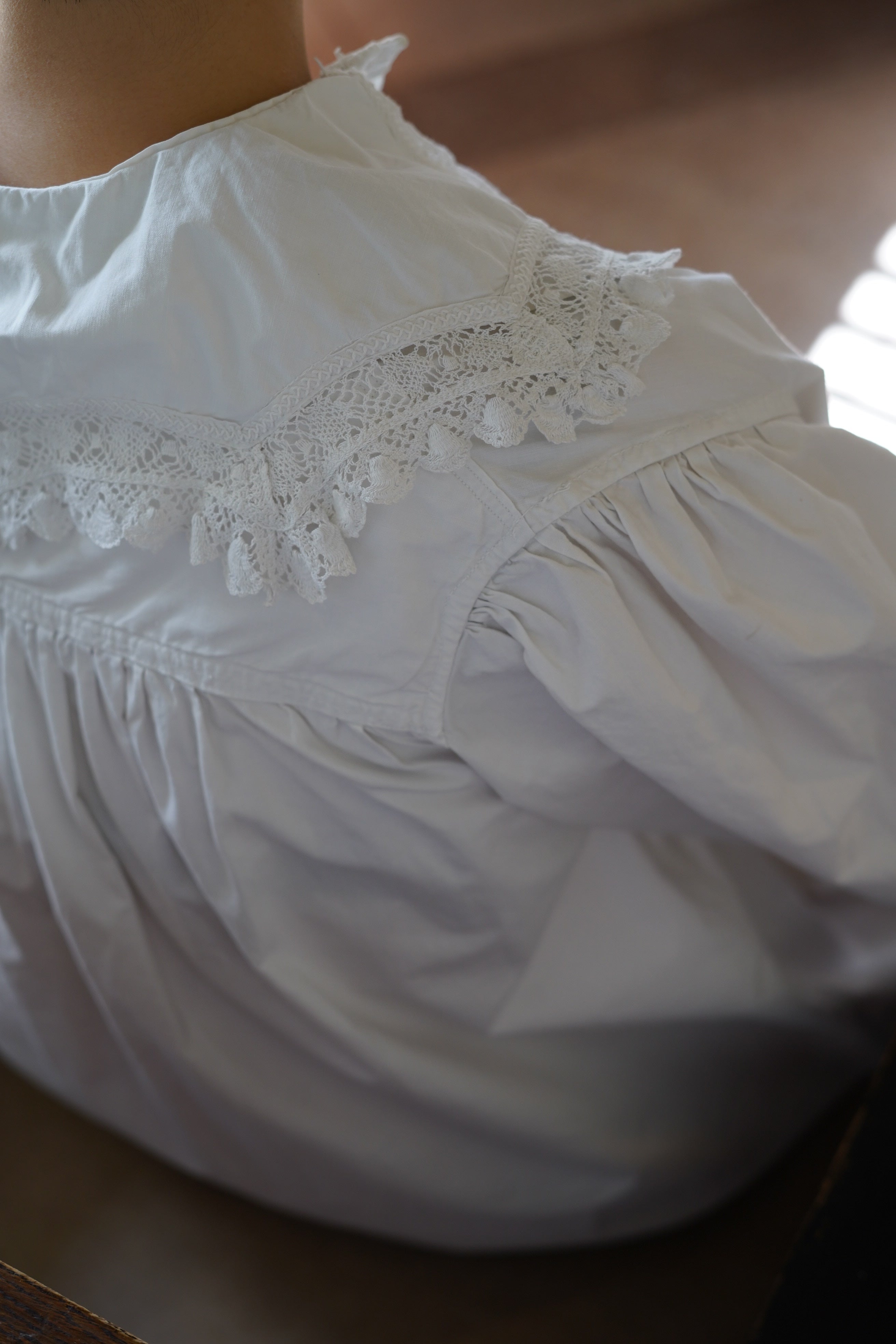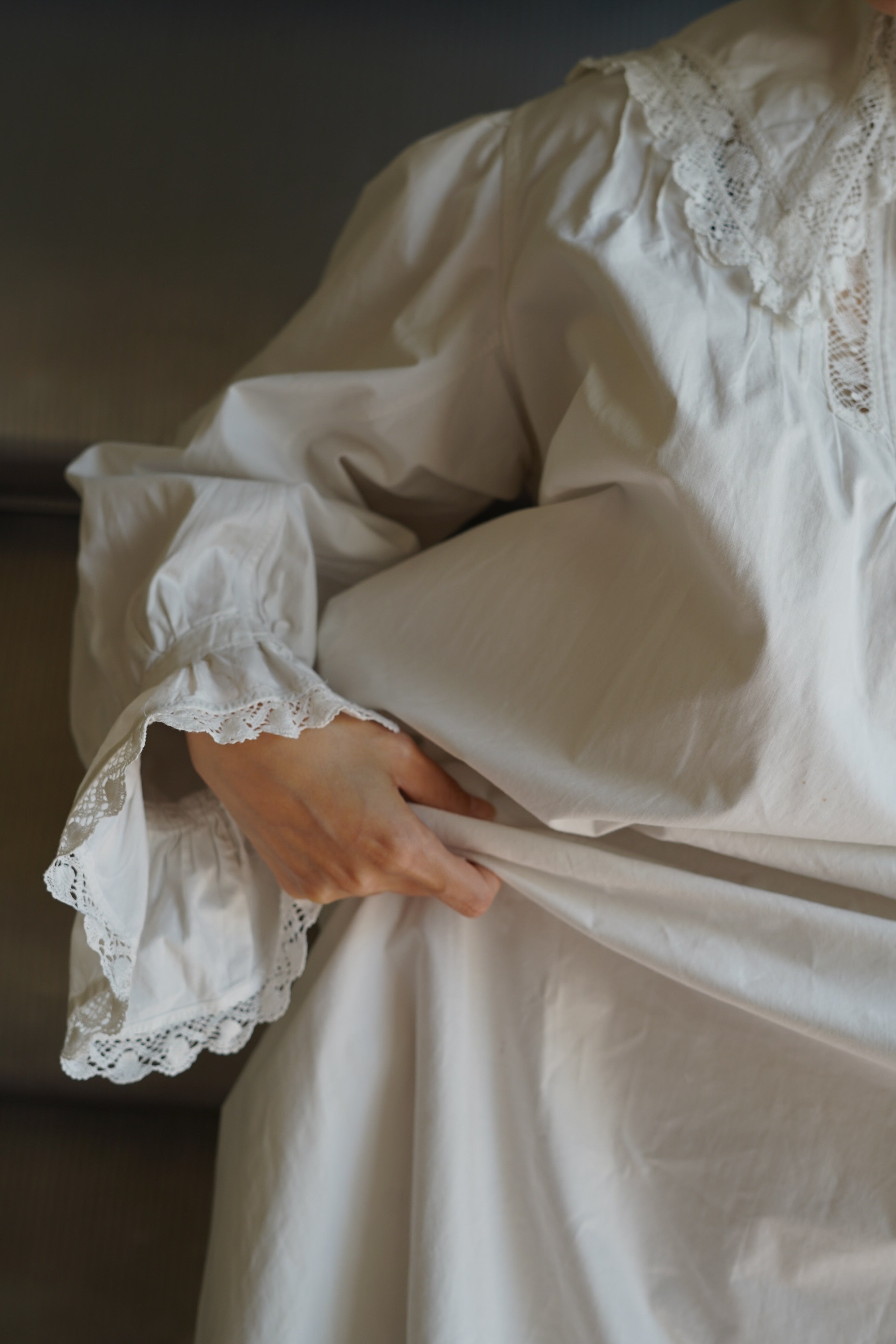 非常に貴重なアンティークのナイトドレスです。繊細なレースやタック、たっぷりとギャザーがあしらわれています。程よいボリュームのあるパフショルダーのバランスも可愛いです。