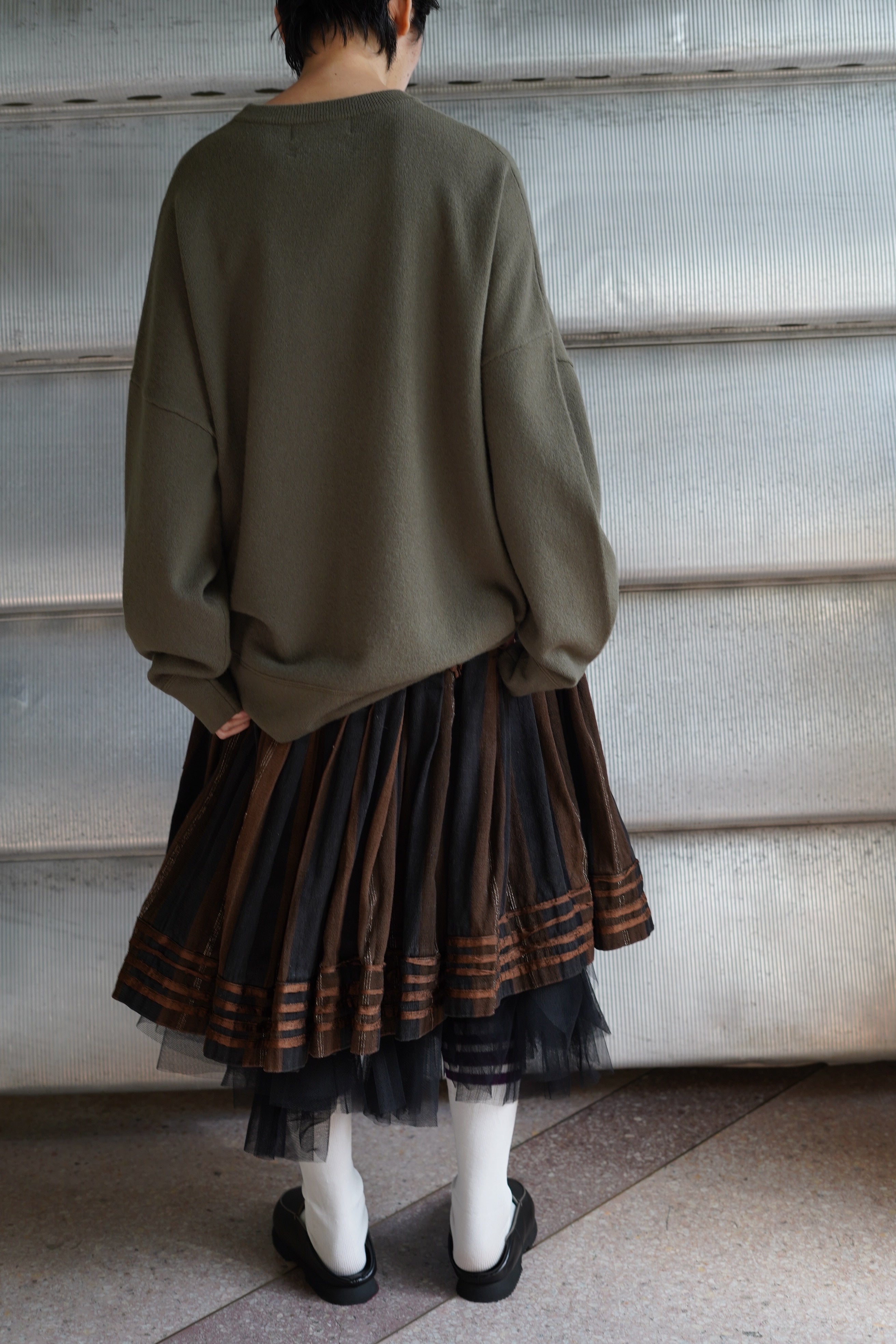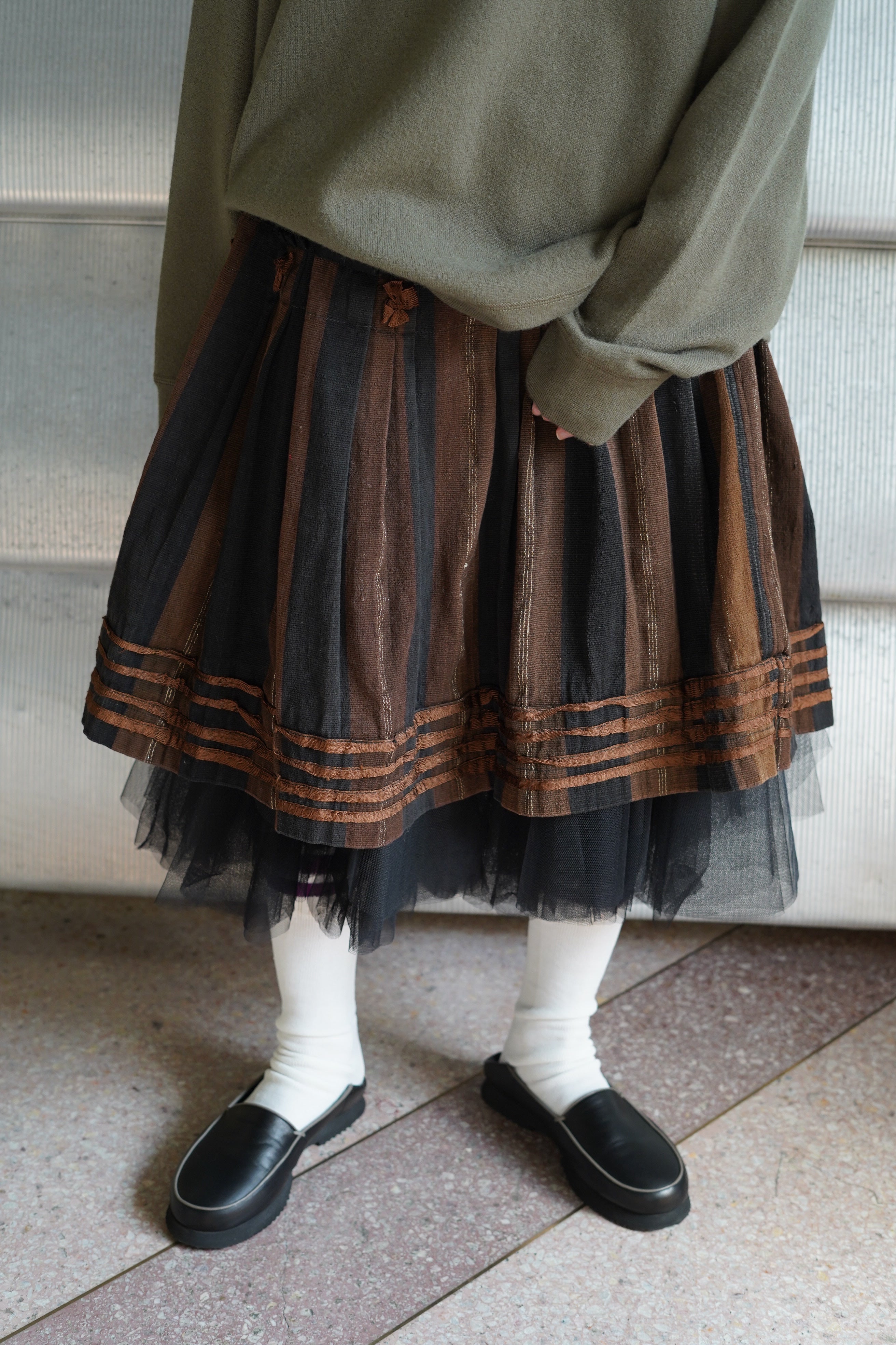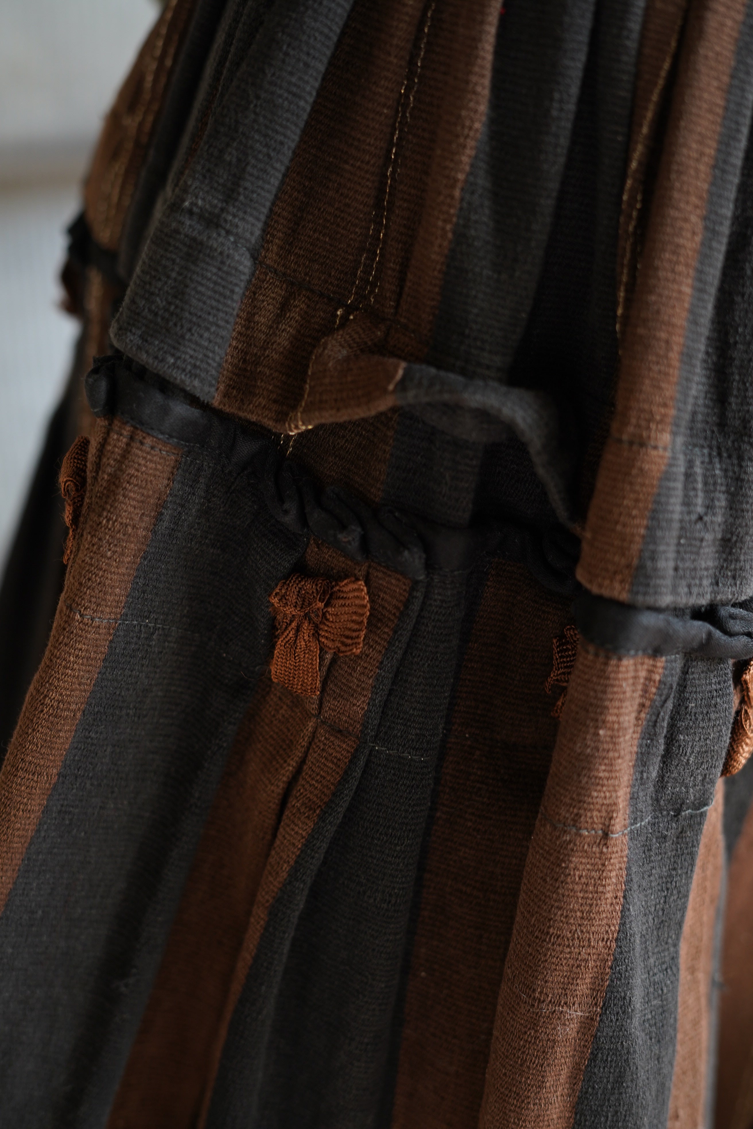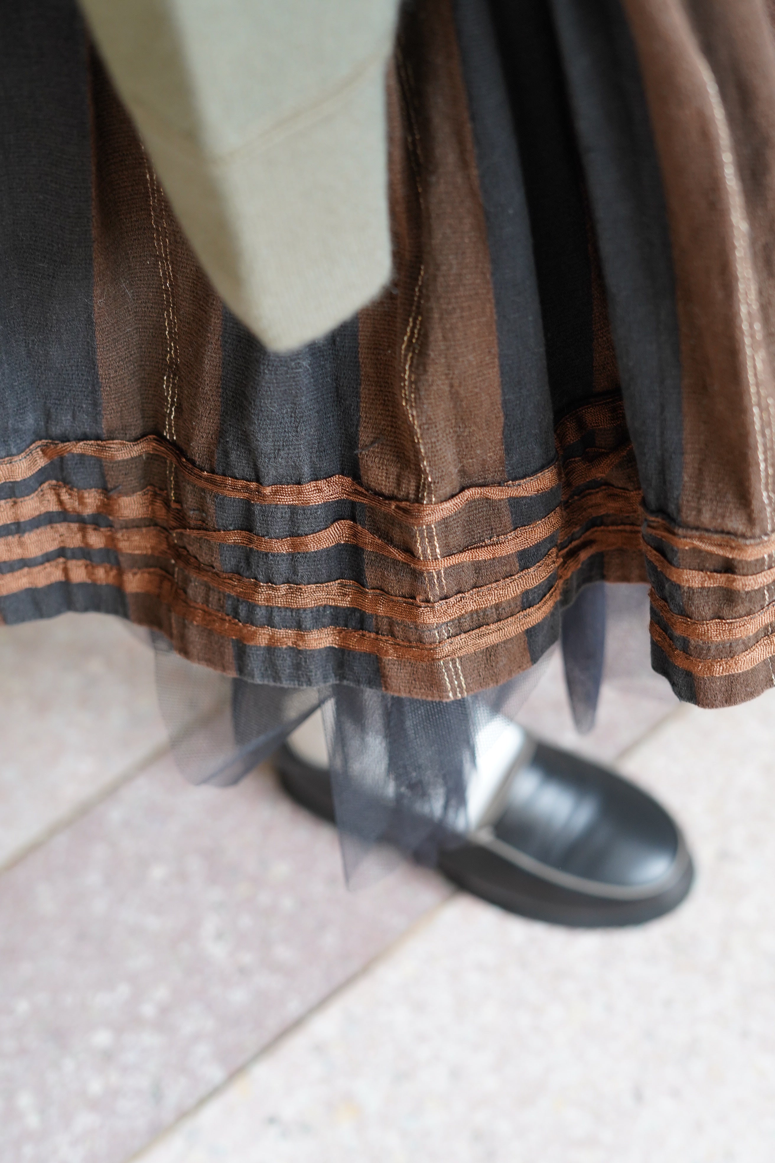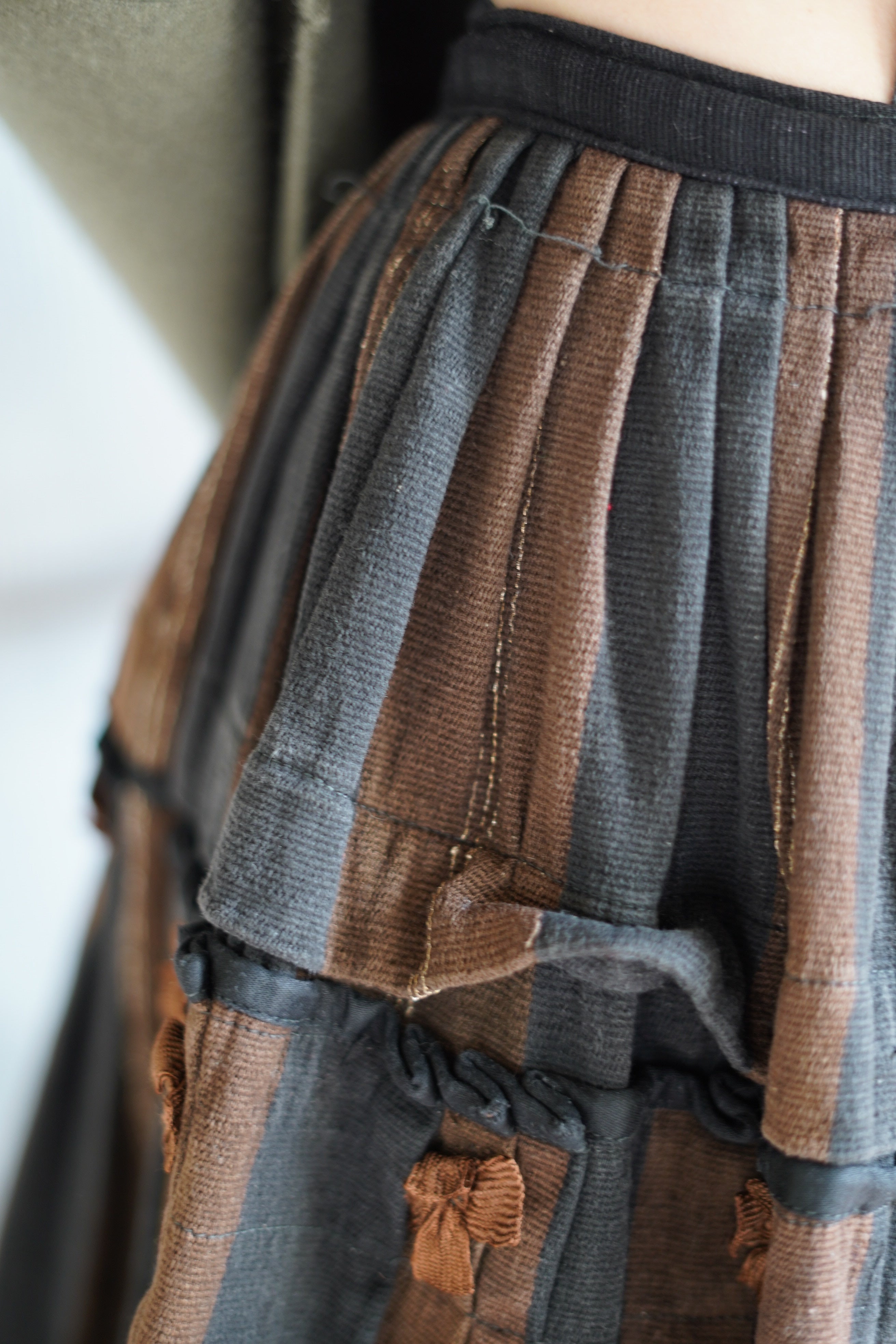 1900年代初頭の東ヨーロッパの伝統的な手織りの生地を使用した一着。リボンやテープをあしらい、控えめながら個性のある表情。 厚みのある生地となります。こちらは伝統衣装の一部でトランシルバニア地方で作られたものと推測されます。もともとペチコートやスカートの上から重ねるオーバースカートとしての用途がありウエストからサイドはラフなホックの仕様なのでインナーに重ね着をお勧めします。(*画像ではインナーにcomme des garconのペチコートチュールパンツを着用しています)VINTAGEYear:EARLY1930SCountry:HUNGARY, TRANSILVANIAMaterial: 表記なし(LINEN)Size: ウエスト約29.5cm,着丈約65cm裾幅150cmMODEL 165cmCondition:全体的に年代相当のヴィンテージコンディションです。ハンドメイドによるデイザン、ディテールのラフさはこちらのアイテムの個性、雰囲気としてご理解ください。