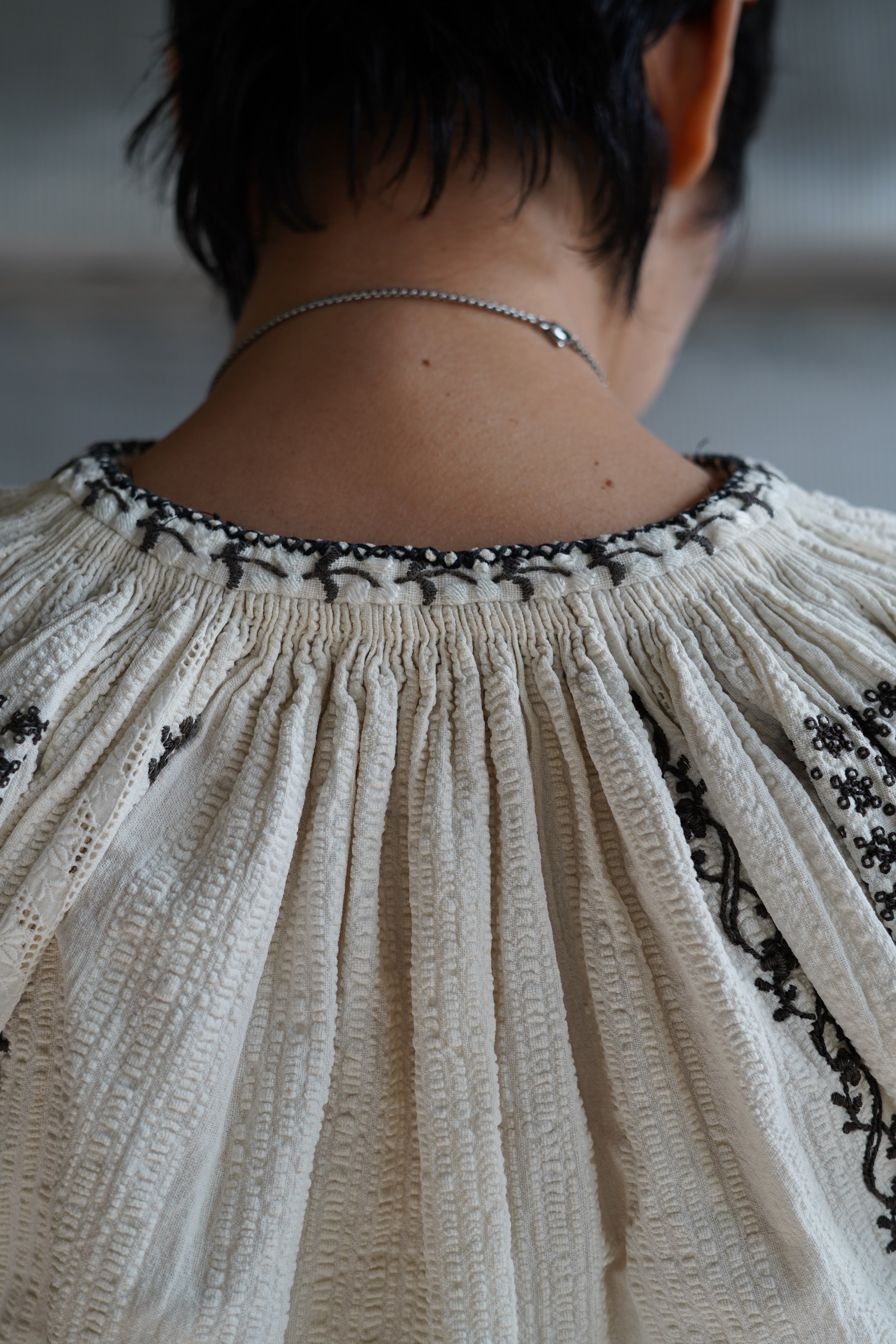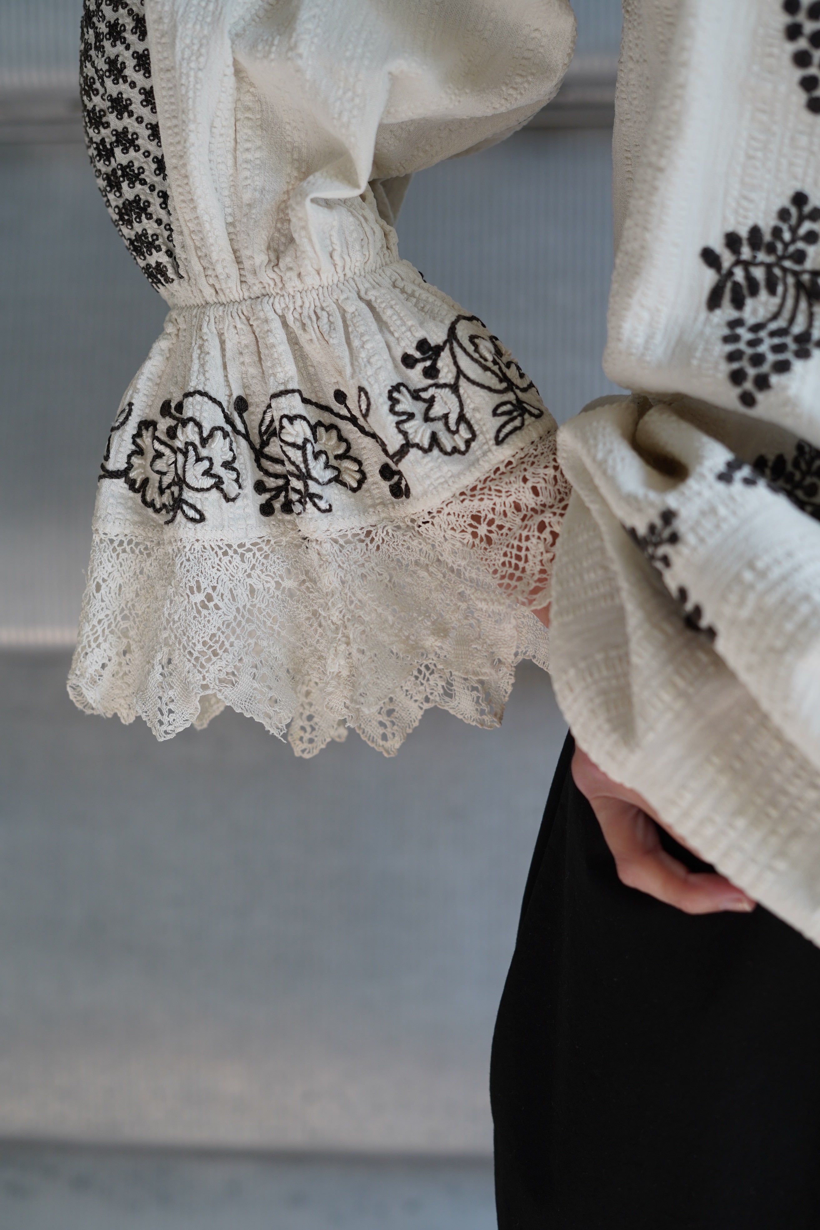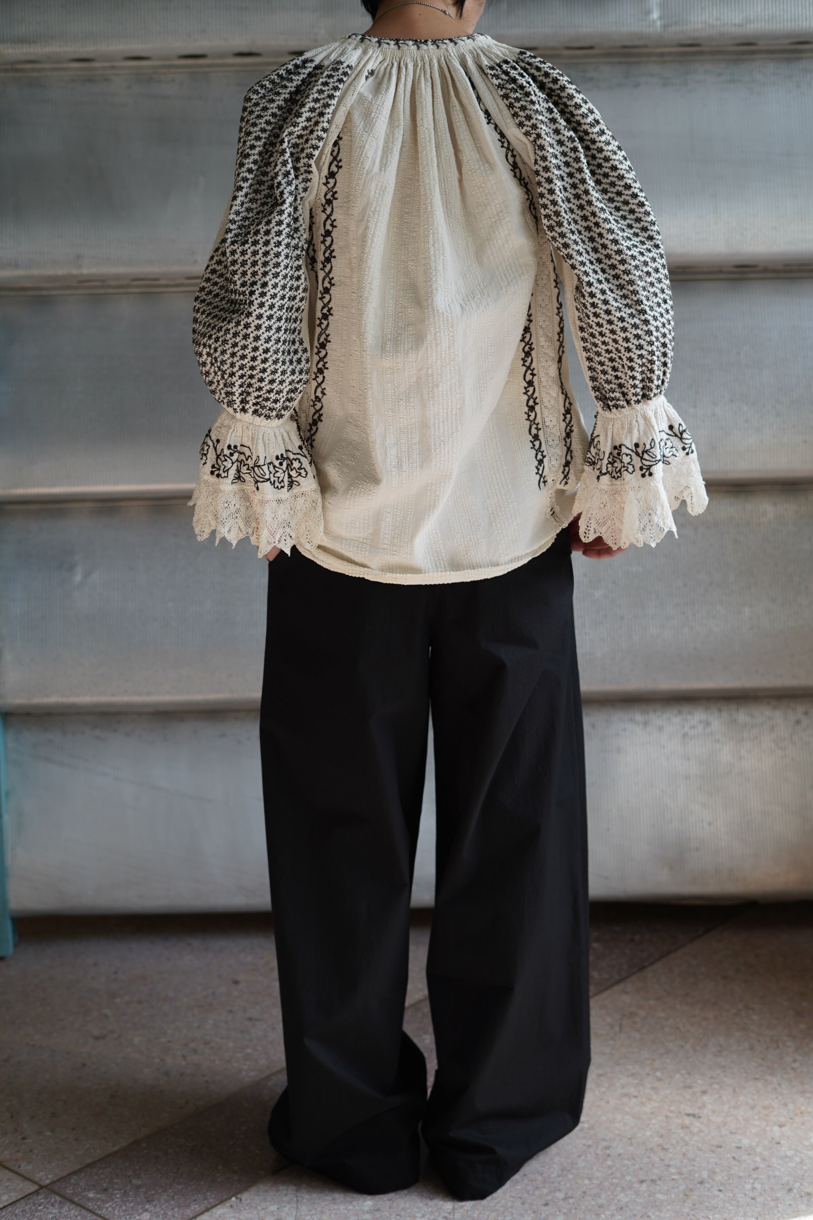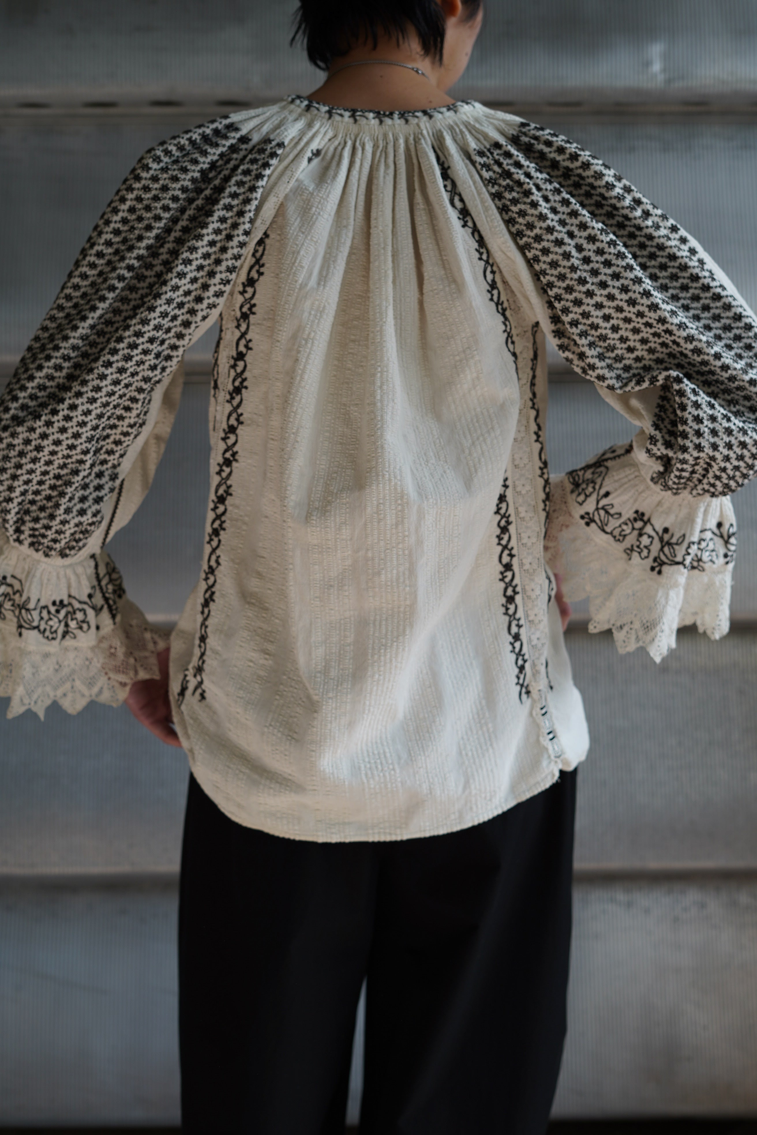 1900年代初頭の東ヨーロッパの伝統的な手織りのリネンを使用し美しい刺繍の装飾が施されています。 袖口にギャザーを寄せたたっぷりとした袖が特徴です。裾には美しいレースが施され、首元同様念入りに刺繍が施されています。このようなブラウスは、若い女性の嫁入り道具として作られることが多く、織物技術と文化的ルーツを象徴するものとして世代を超えて長く受け継がれてきた美しい伝統衣装の一部です。自由にユニークで個性的なバランスで楽しんでください。VINTAGEYear:EARLY1920SCountry:ROMANIAMaterial: 表記なし(LINEN)Size: 袖天幅約14cm,裄丈(レース込み)67cm,裾幅59cm,着丈 約67cm身幅50cm *もう一つのものよりも若干脇下が狭くなっています。MODEL 165cmCondition:全体的に年代相当のヴィンテージコンディションです。こちらのアイテムの個性、雰囲気としてご理解ください。