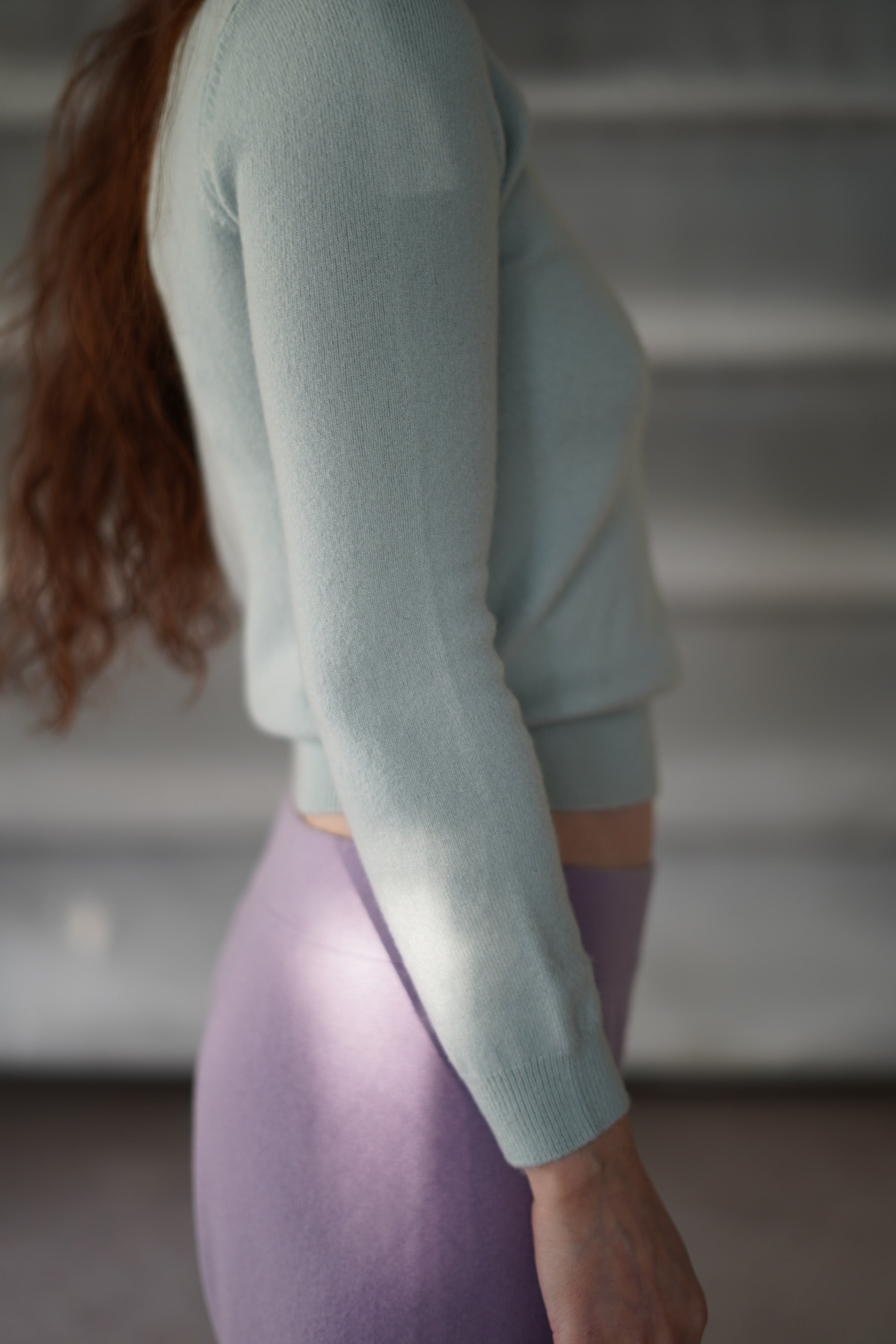 定番のコンパクトなクルーネックトップスです。あえてローライズのボトムとあわせてへそだしルックを楽しむのも好きです。もちろん、ハイウエストのボトムスとだとちょうど良いバランスの丈を楽しめます。ストレッチの効いたカシミアセーターは今までのニットの概念を取り払って、よりカジュアルに枠にはまらず自由に楽しみたいアイテムです。