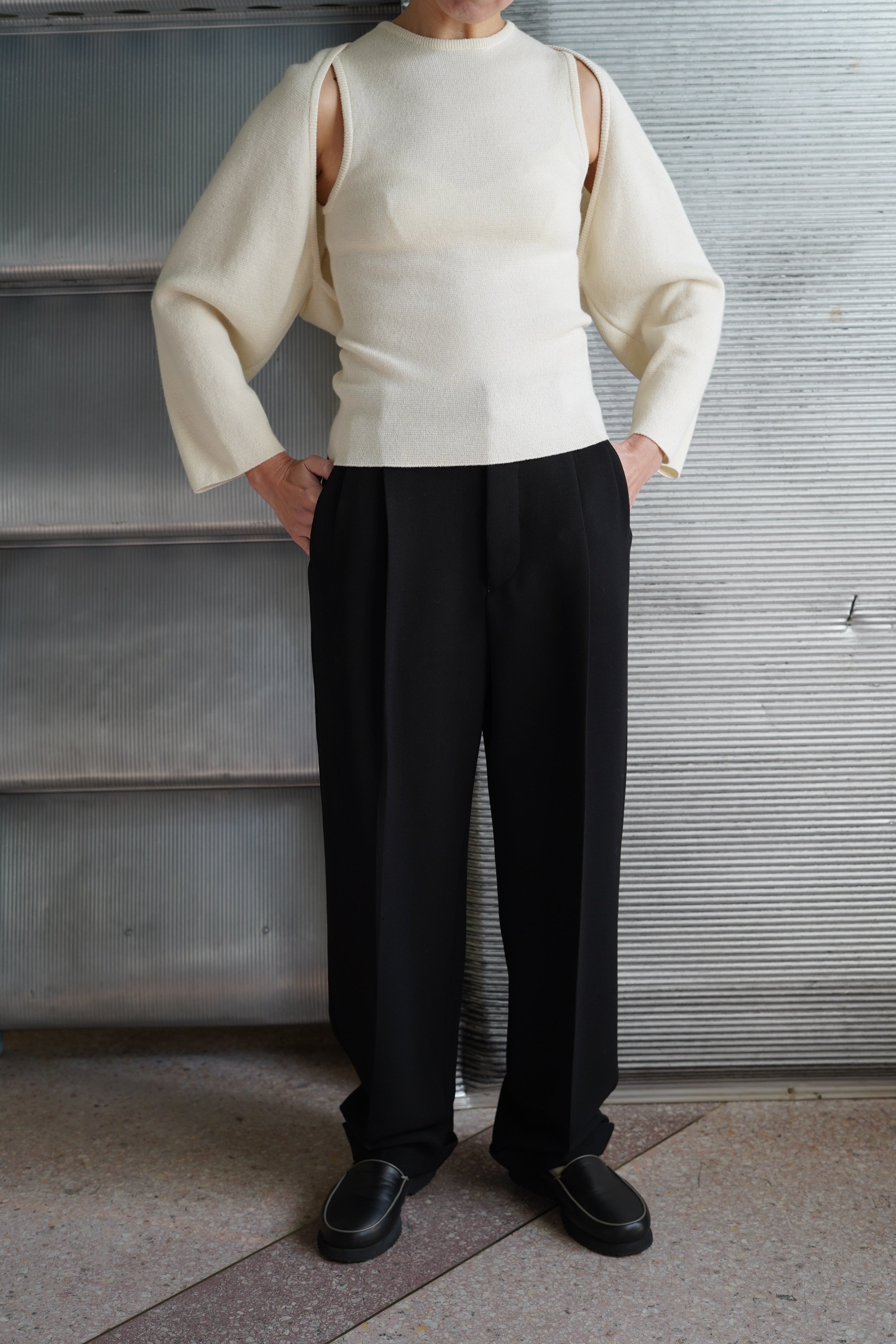 カシミヤシルクの柔らかな肌触りのデイリータンクトップです。インナーにもちょうど良い一枚です。pelleqQUALITY:CASHMERE 70%, SILK 30%COLOR:WHITE,RED,BLACKSIZE:36165cm styling with Vintage ROMEO GIGLI trousers