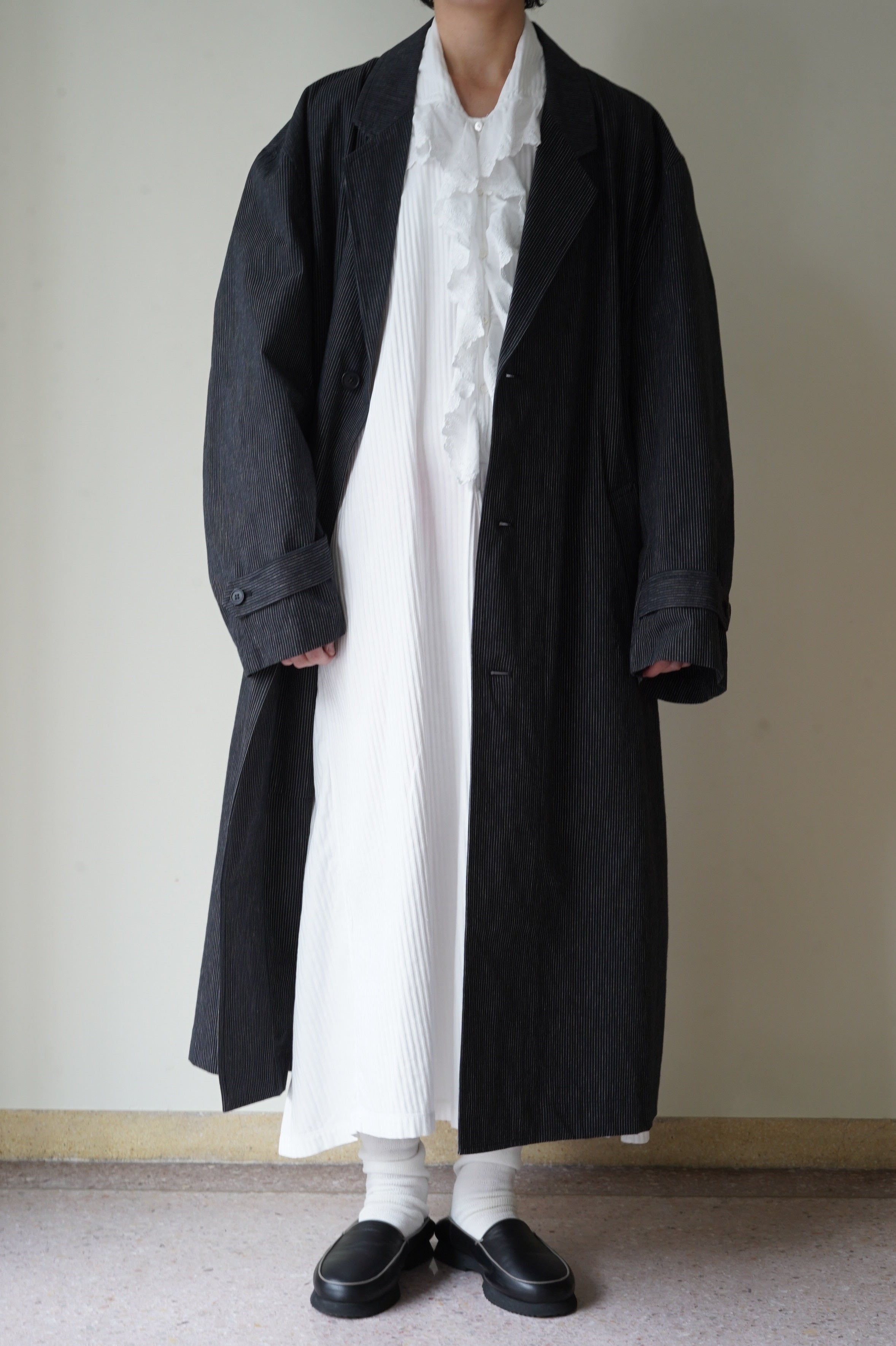 UNISEX ITEM季節の狭間にちょうどよい軽さのあるロングトレンチコートです。程よい厚みとハリのあるコットン生地は、独特の手触りとランダムなピンストライプがとても美しく手仕事ならではの表情を持っています。特別なシーンでなくても、丁寧で心豊かな暮らしのデイリーウエアとして。良いものを永く、大切に着るというチョイスを。CRISTASEYAMATERIAL:100% COTTONCOLOR:BLACK WITH WHITE STRIPESSIZE:XS,M,165cm /173cm MSHOPPING GUIDE >>>